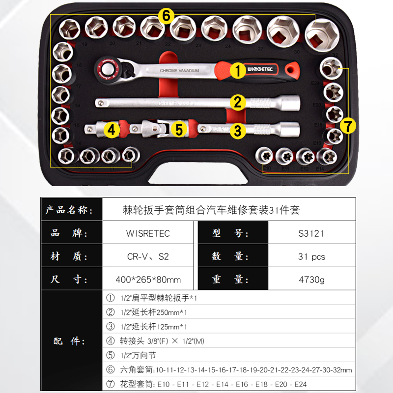Industrial Grade Quality 1 2 Socket Ratchet Wrench Multifunctional Auto Repair Toolbox Combination 31 Piece Set