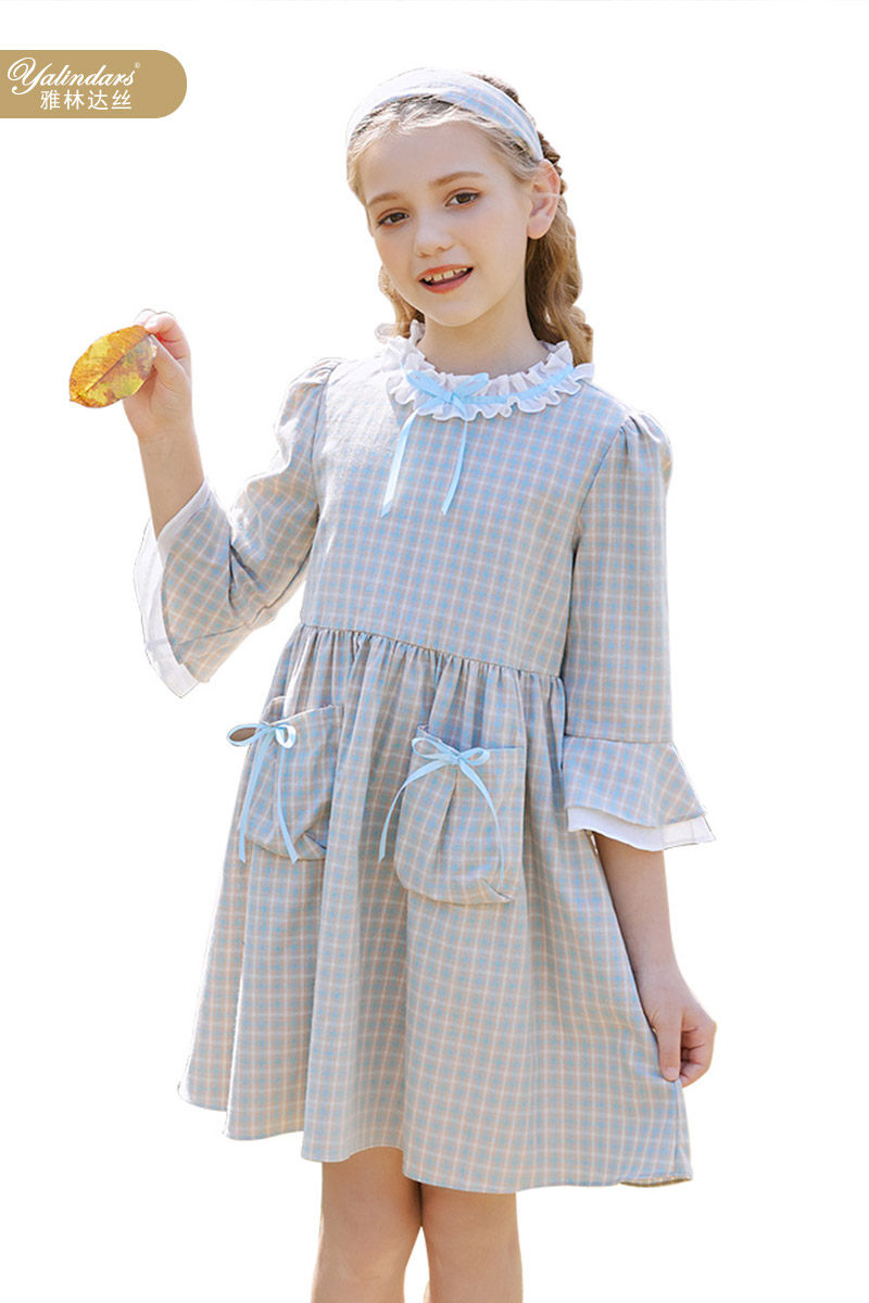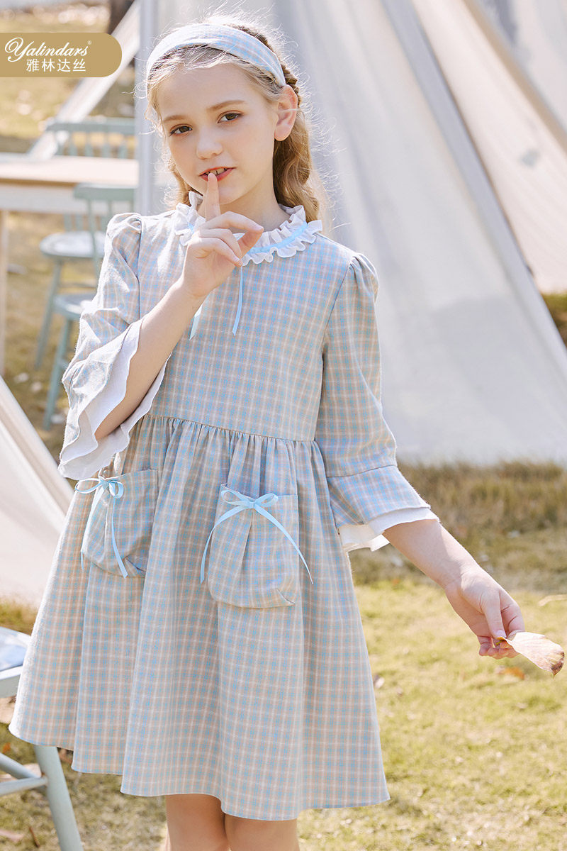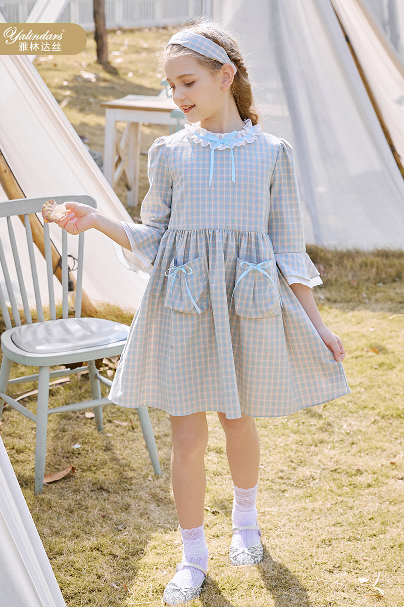 Yalindasi girls' dress spring 2022 new round neck children's long-sleeved princess dress Western style plaid skirt trend