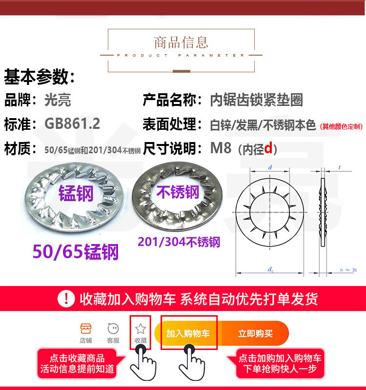 304 stainless steel inner serrated lock washer GB861 2 galvanized 65 manganese inner multi-tooth gasket M3M4M5M6-M24