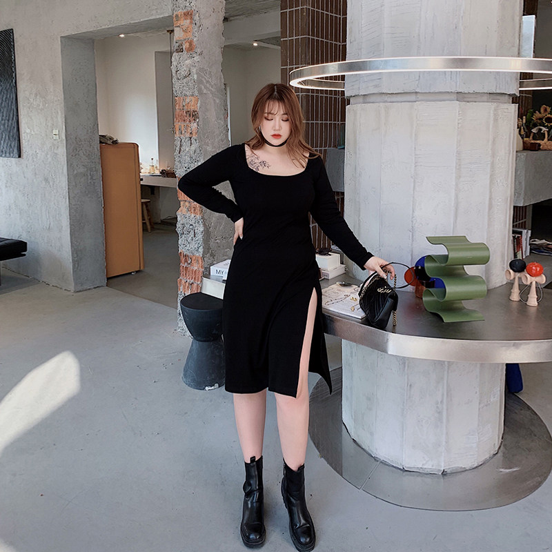 Hitong's large size female dress Fat mm temperament brief High open fork Sexy ocean dress cover 100 hitch knit long skirt