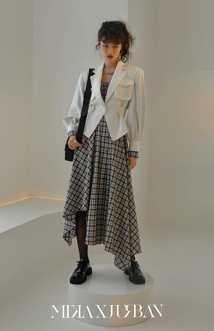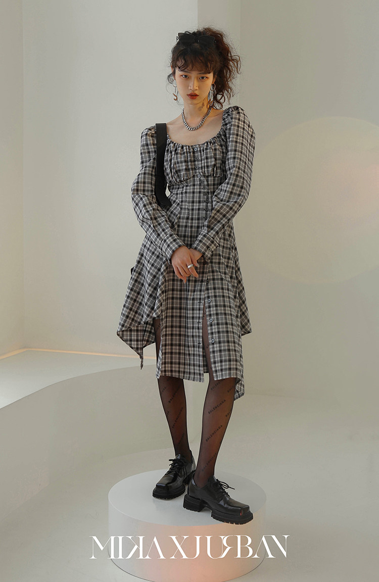 MXU Spring Autumn Fa Style Retro small crowdDesign Sense dress Slim Foam Sleeves Plaid Long Sleeve Foreign Dress Woman