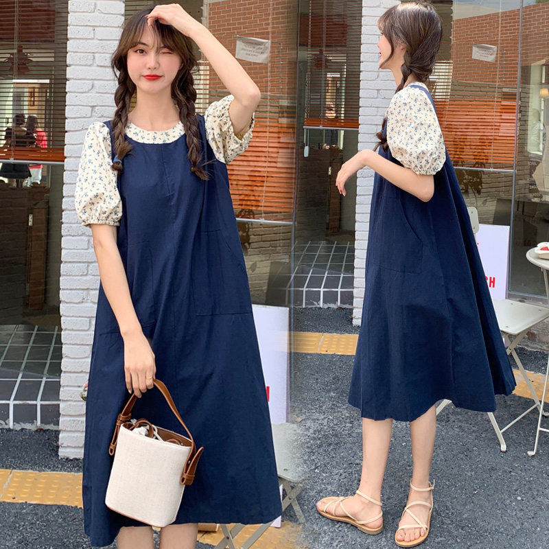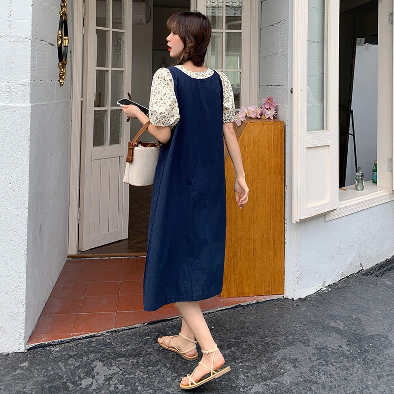 Pregnant women summer season large size Korean version fake two pieces of cotton floral mid-length version temperament loose literary new dress