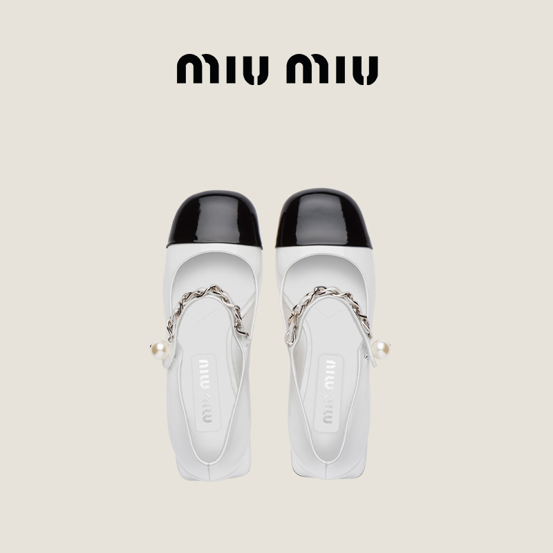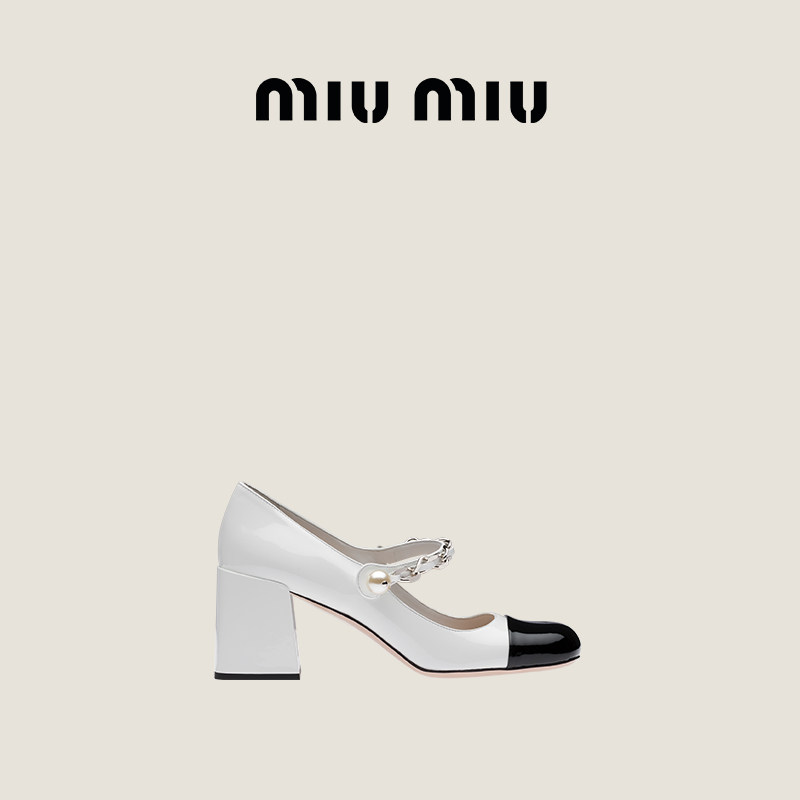 (12 period free of interest) Miu Miu Miu Miao imitation pearl decoration coarse heel lacquered leather Mary Jane high heel shoes-Taobao