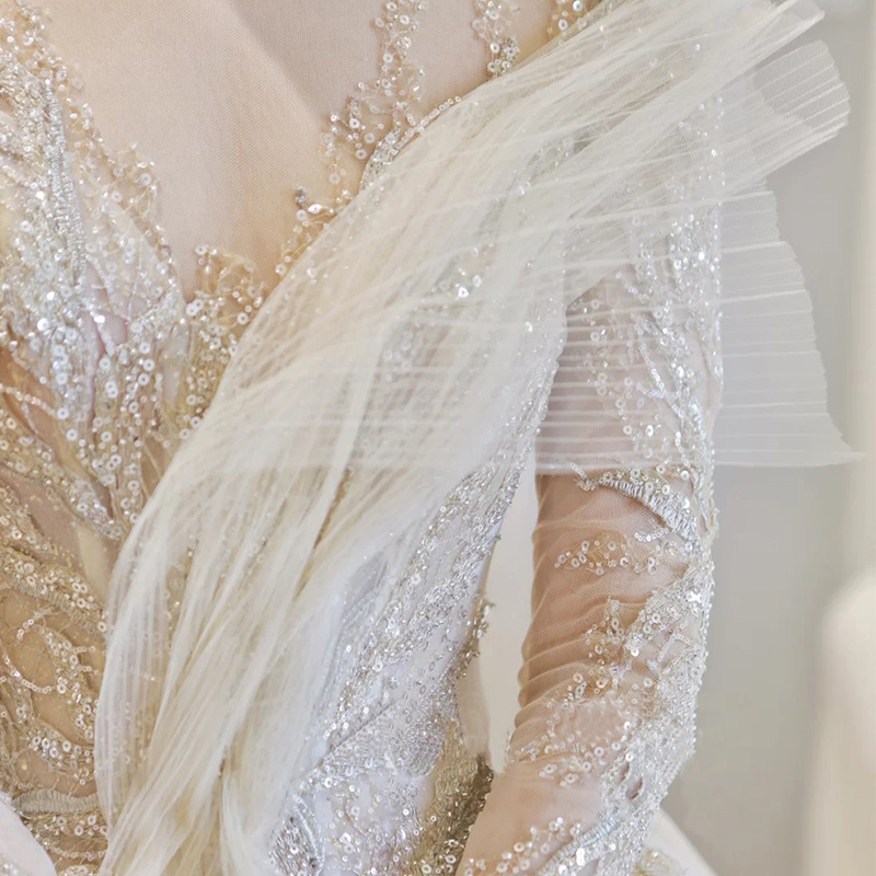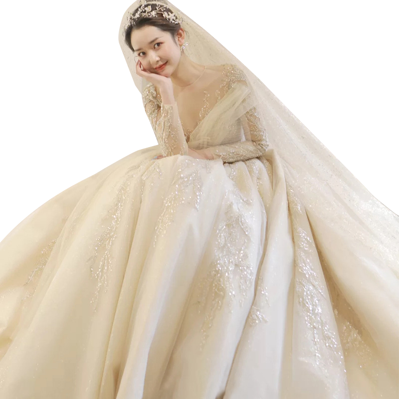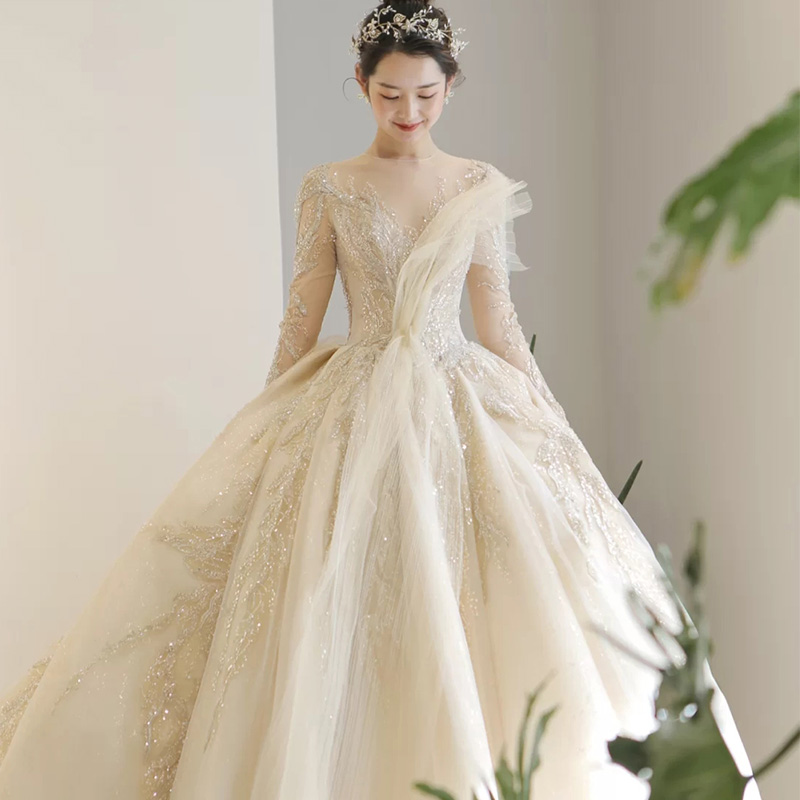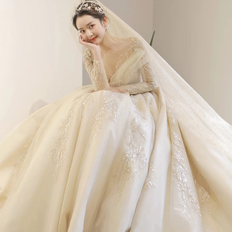 French Light Wedding Dress 2023 new bride main veil long sleeve heavy retro - tail grand tail little texture