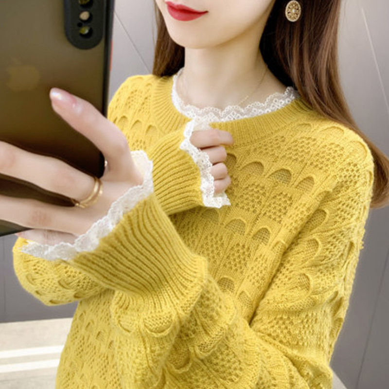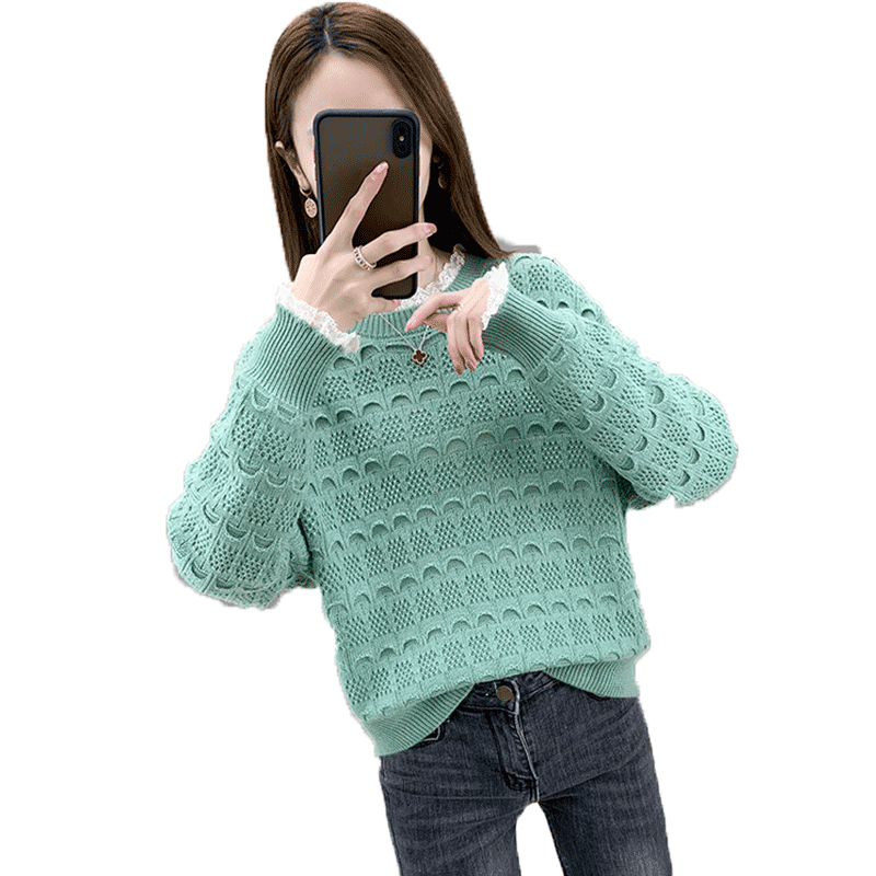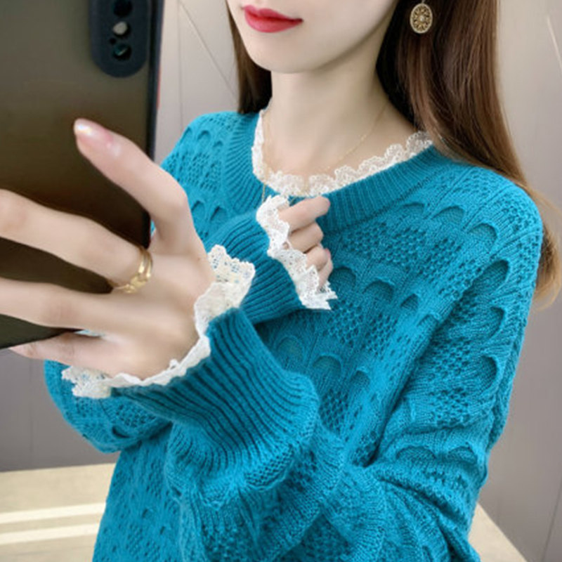 Lace stitching short women's sweater spring and autumn 2021 new women's loose outer wear sweater foreign style blouse