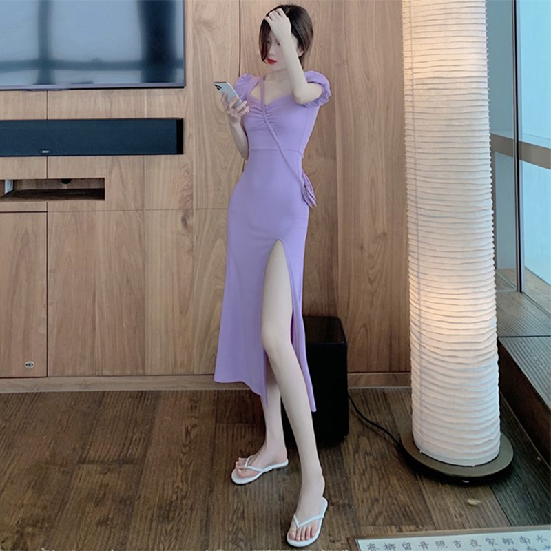 French vintage split sexy hip bubble sleeve dress women slim slim temperament skirt summer to ankle