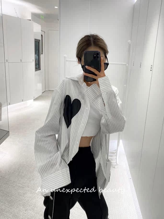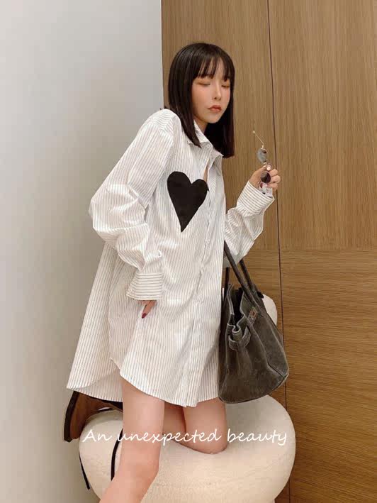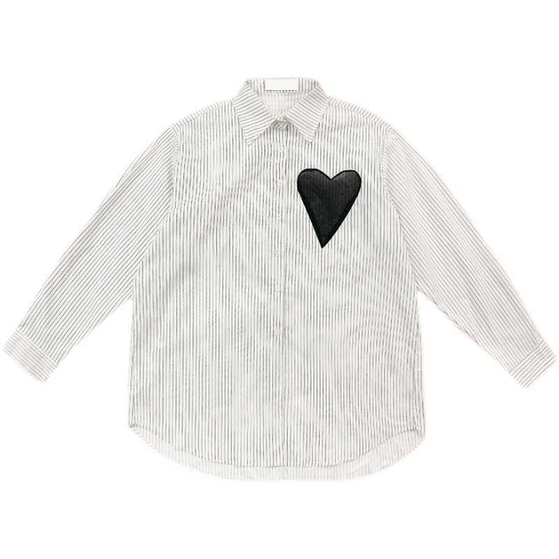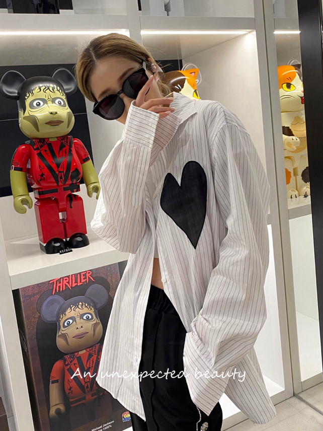 Korea kimhekim top shirt love striped long-sleeved shirt peach heart print casual white