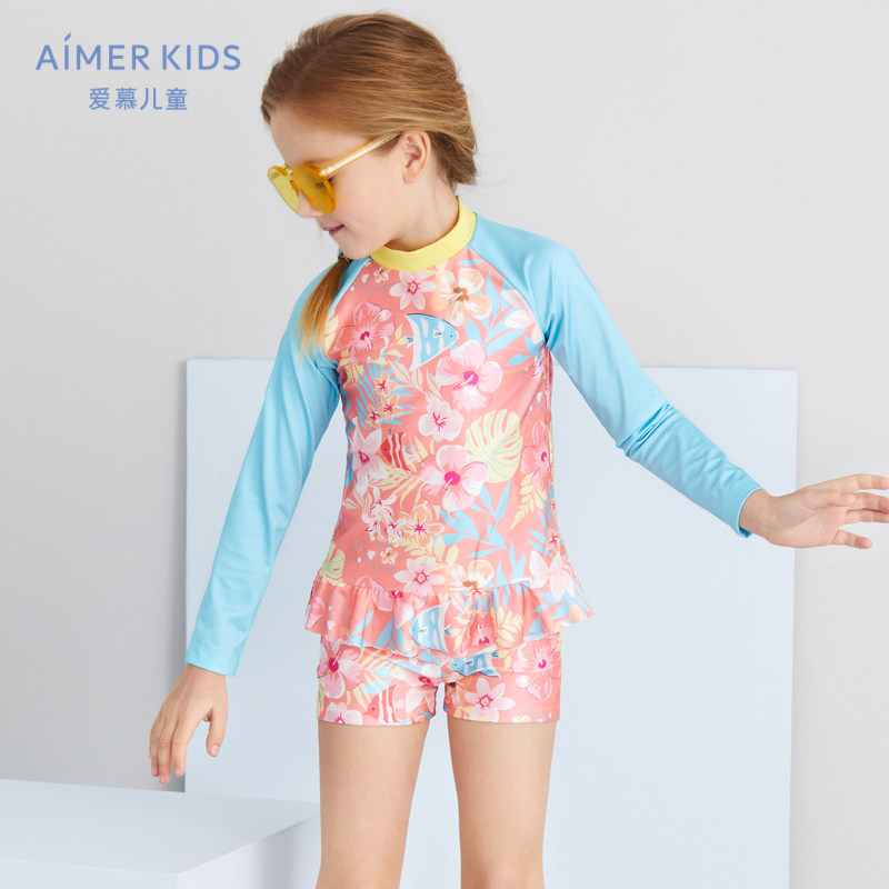AIMER Children Long Sleeves High Collar Sweet Beauty Printed Sun Protection UV Swimsuit Sports Class Suit Girls Girl Students