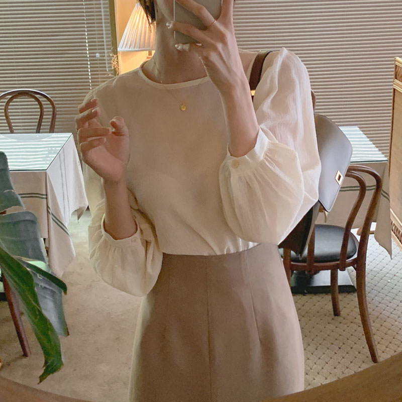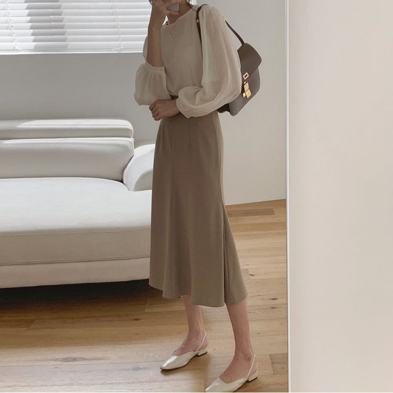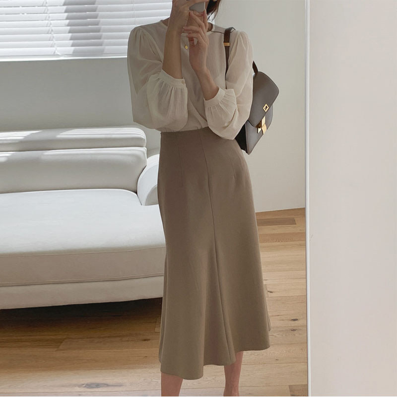 Apricot blouse with a half-body skirt.