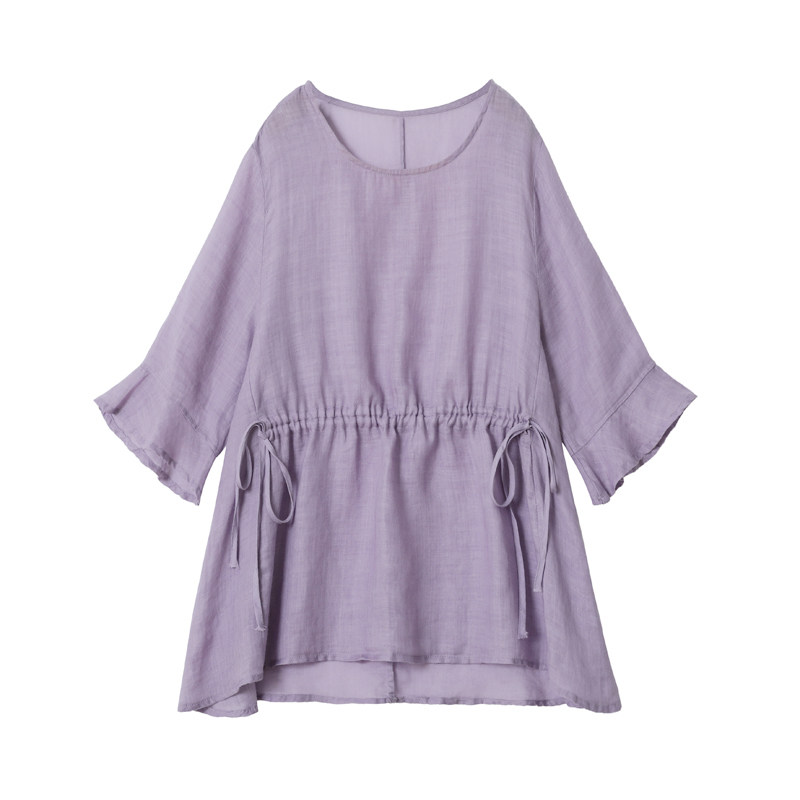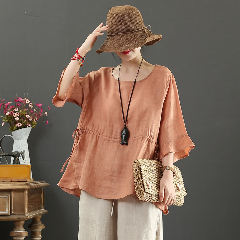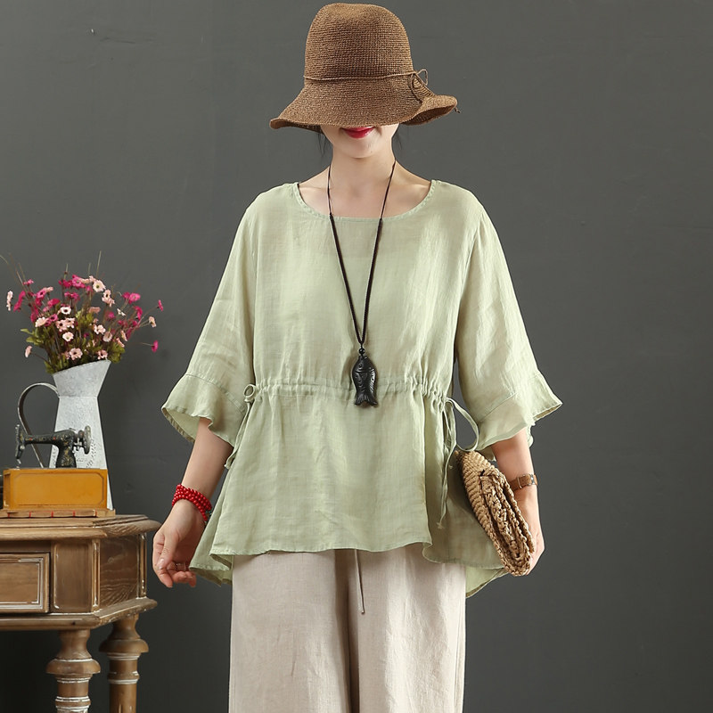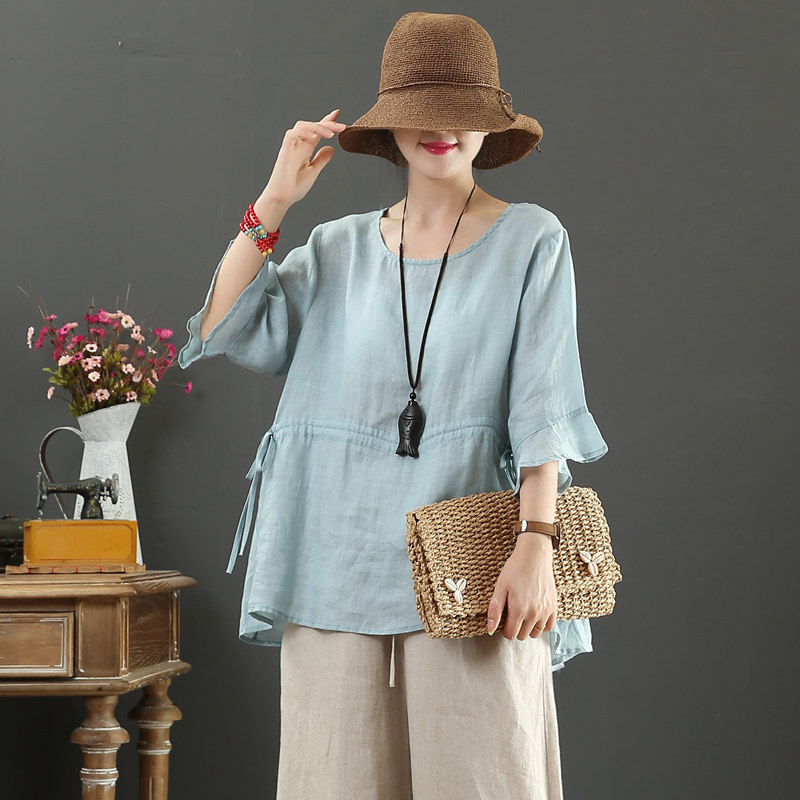 100% Pure Hemp Round Neck Loose Drawstring Large Size Literary Cotton Linen Trumpet Sleeve Summer Dress Women's Half Sleeve Shirt 9189