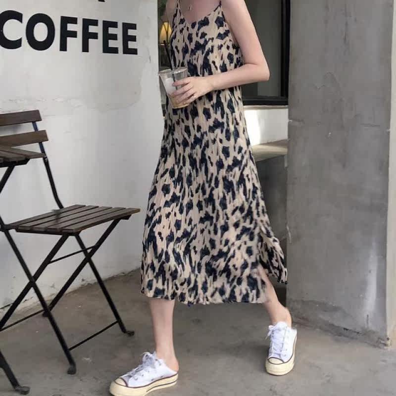 Spring 2022 new ink smudge painting print crumpled suspender skirt female small mid-length dress