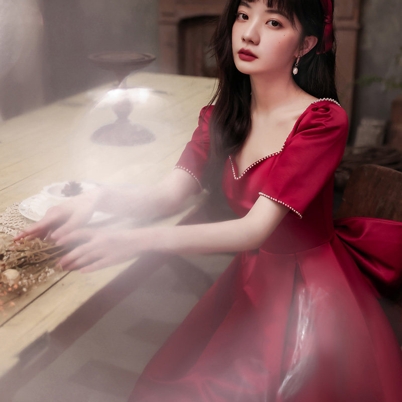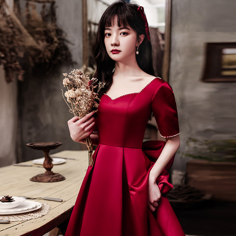 Toast dress bride 2022 new burgundy satin high-end temperament small man engagement back door dress dress pearl