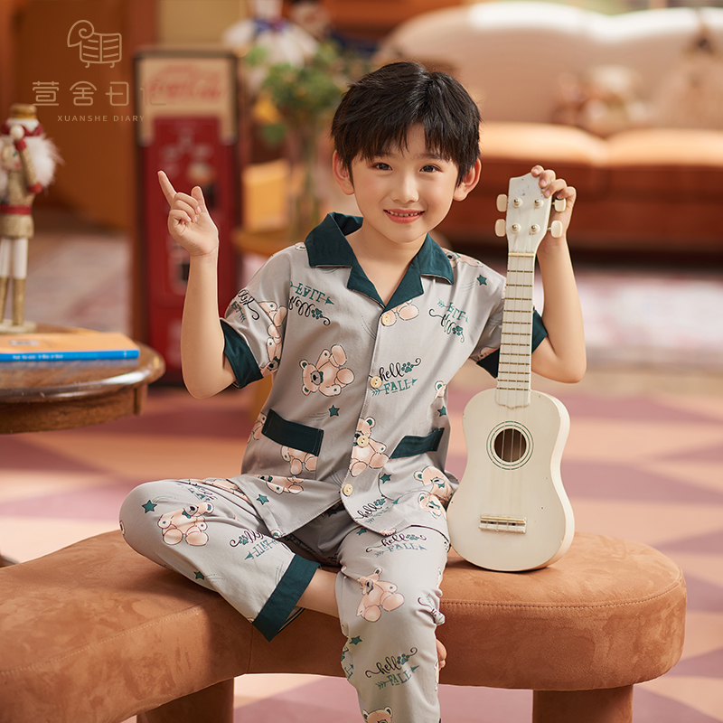 Child Sleepwear Summer Boy Short Sleeve Pure Cotton Summer Thin boy 12-15-year-old CUHK Home Residence Suit Suit