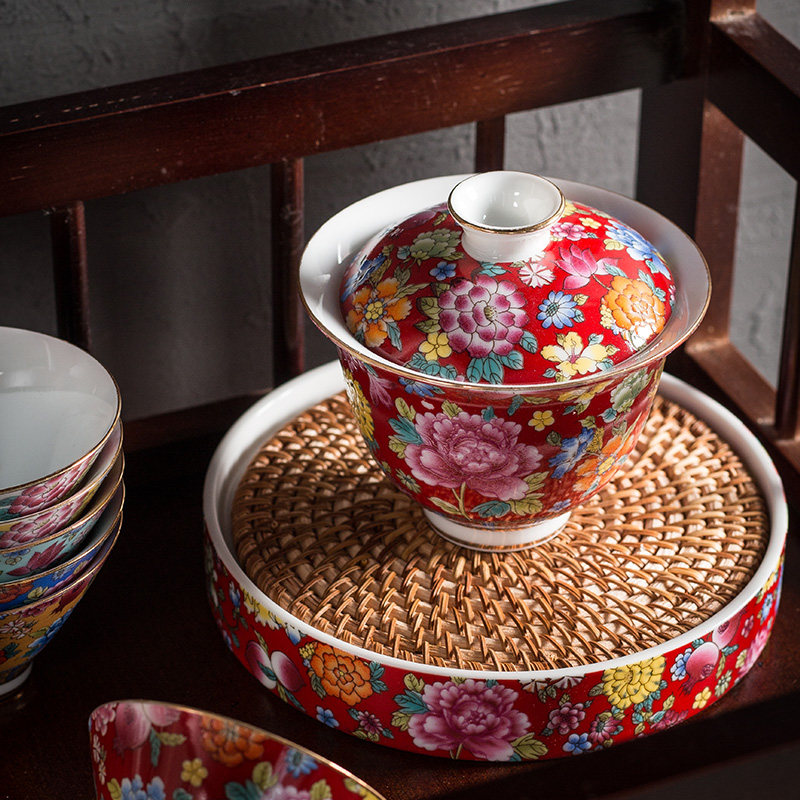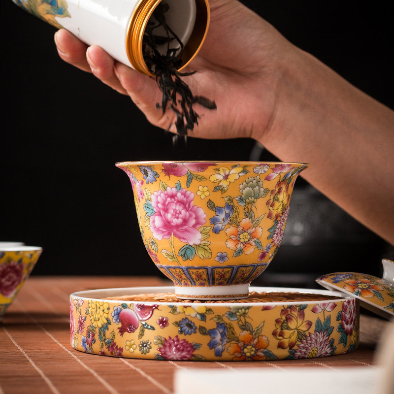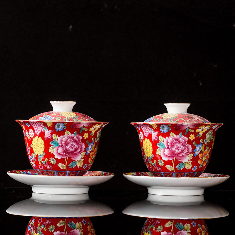 Chinese-style enamel-colored three-cai bowl pot bearing a single tea bowl large ceramic pastel grilled flower kung fu tea set tea cup