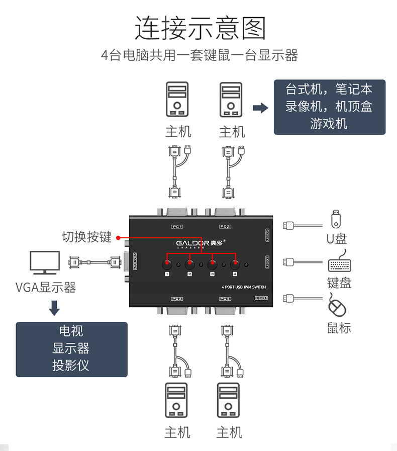 High-multiple VGA KVM switcher four-in-one-out USB key mouse monitoring computer host film distribution sharing display