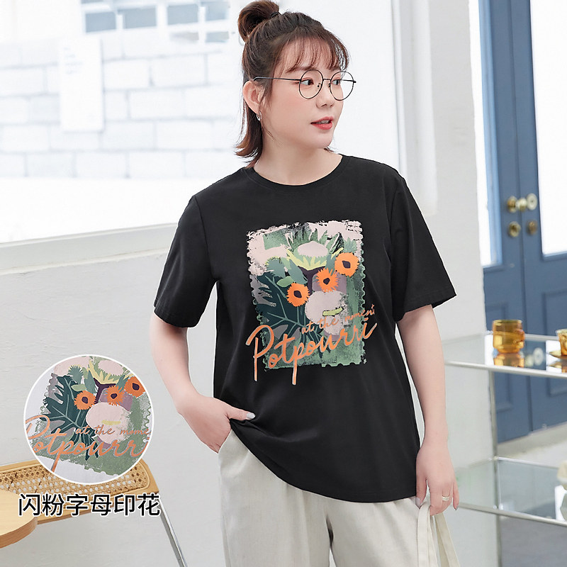 MsShe large size women's clothing 2021 new summer fat sister retro literary glitter ink base white T-shirt