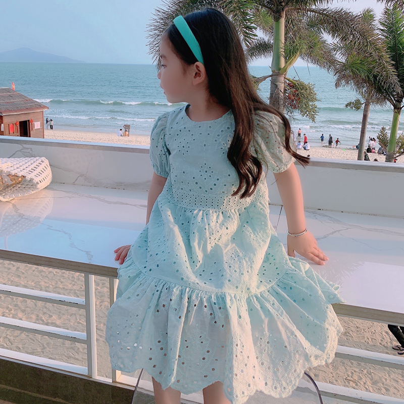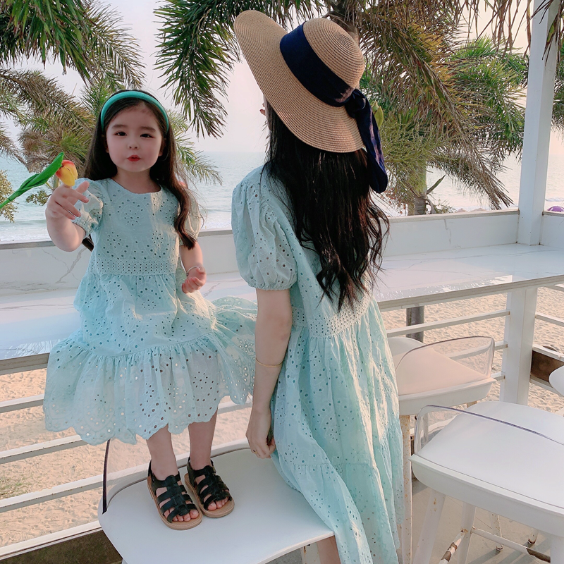 2022 Summer new parent-child dress for girls embroidered hollowed-out bubble sleeveless beach holiday dresses