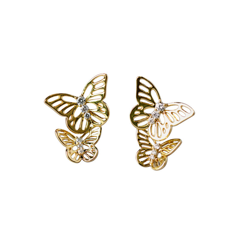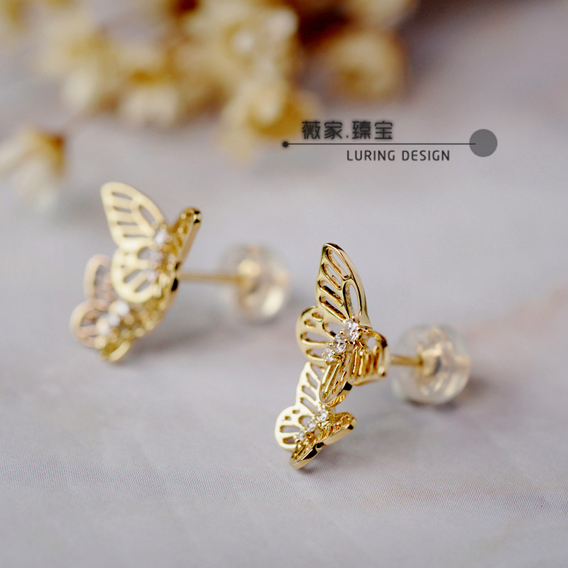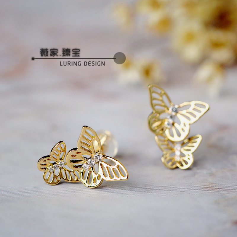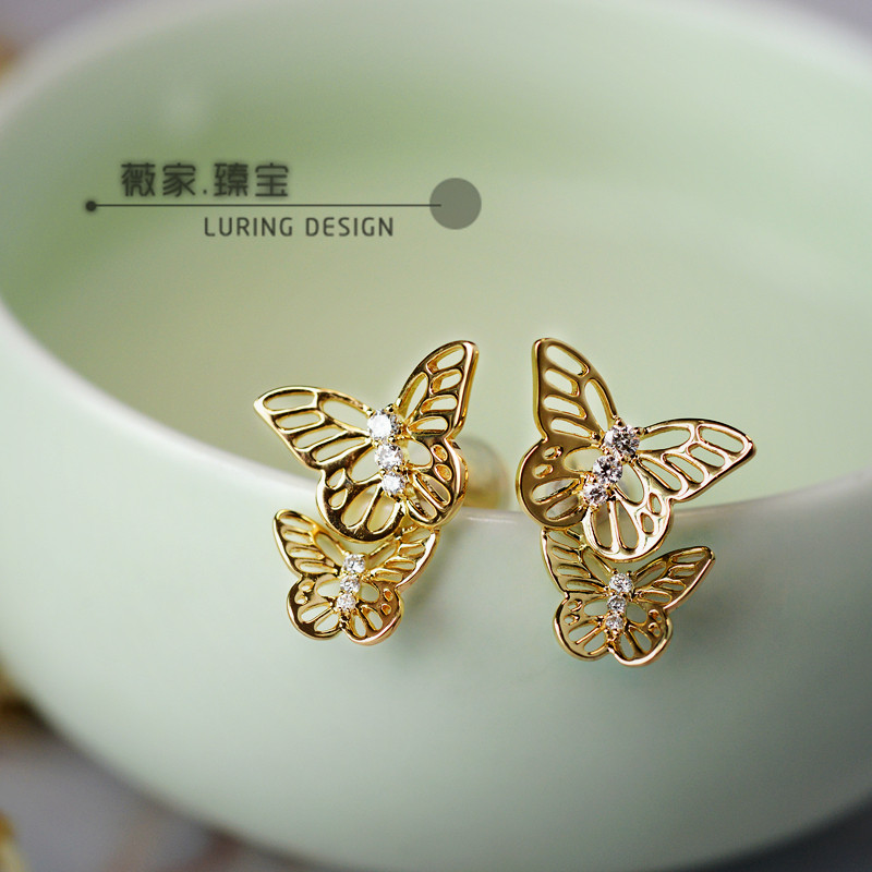 "Wei Family" Double Fly Exclusive Design Hollowed-out Small Butterfly Inlaid Diamond 18K Gold Pure Gold Ear Pierced Ear Accessories