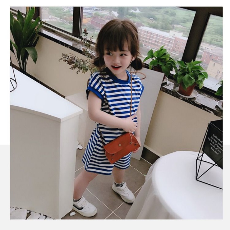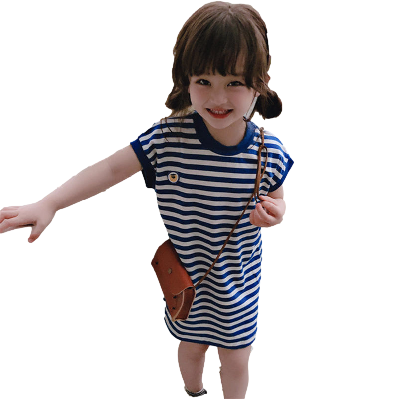 2021 Summer new children Leisure medium Long version for girls Navy Wind Blue Stripes sleeveless T-shirt dress