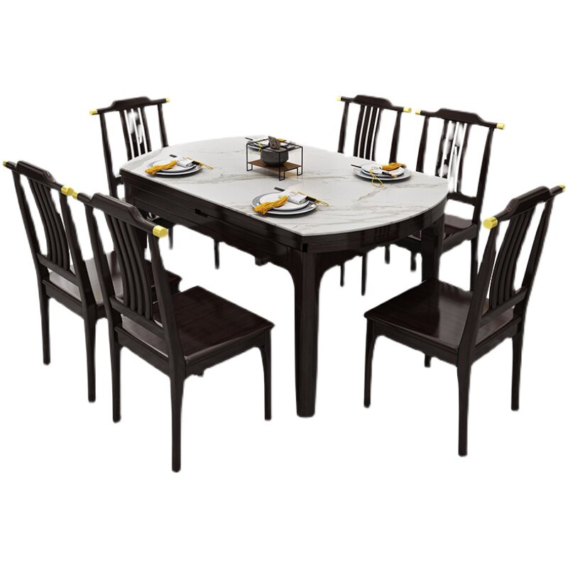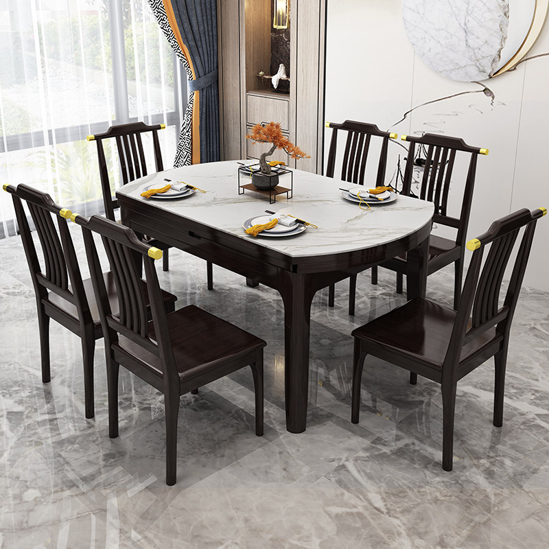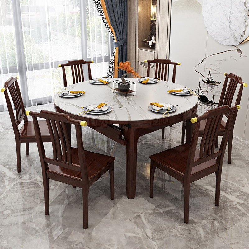 New Chinese solid wood rock plate table with telescopic folding dining table and chairs combined modern minimalist family small family round table-Taobao