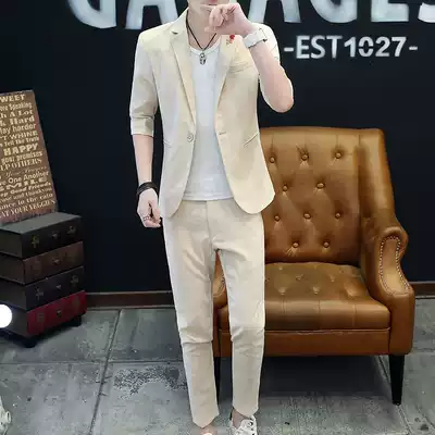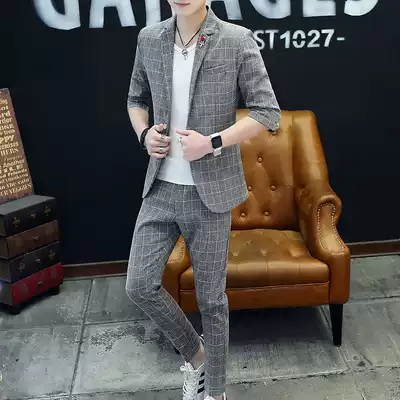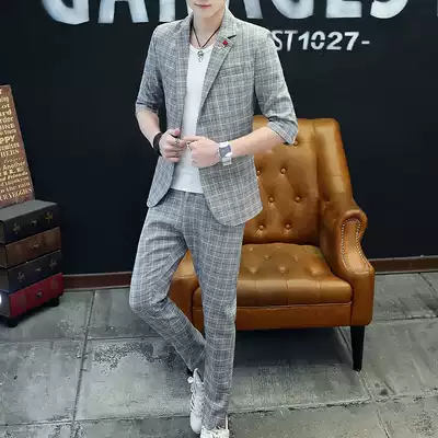Plaid suit suit men's spring and summer thin Korean version slim trend handsome mid-sleeve small suit men's two-piece suit