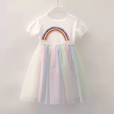 Korean girls short sleeve dress 2020 Summer Children foreign pie mesh dress baby rainbow puffy princess skirt