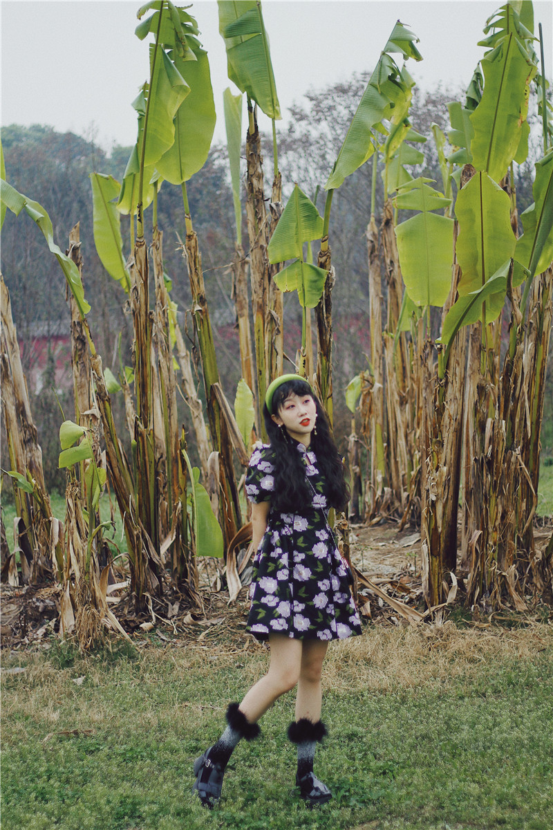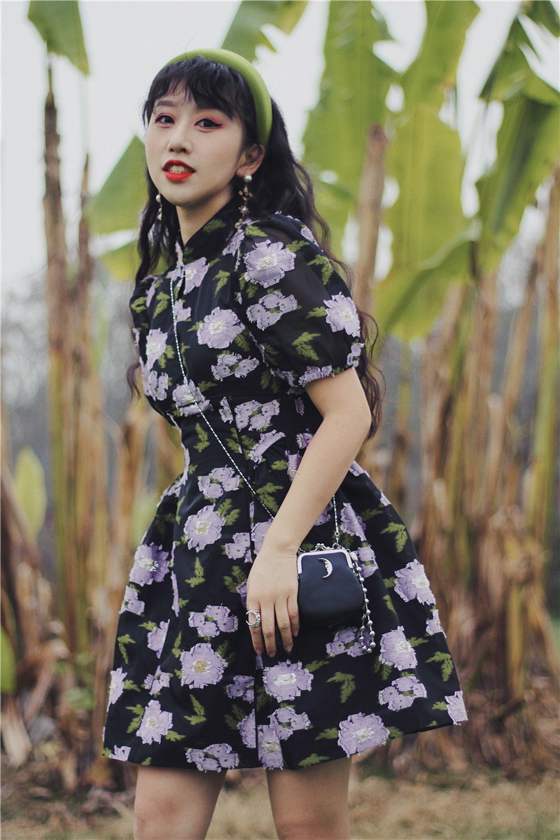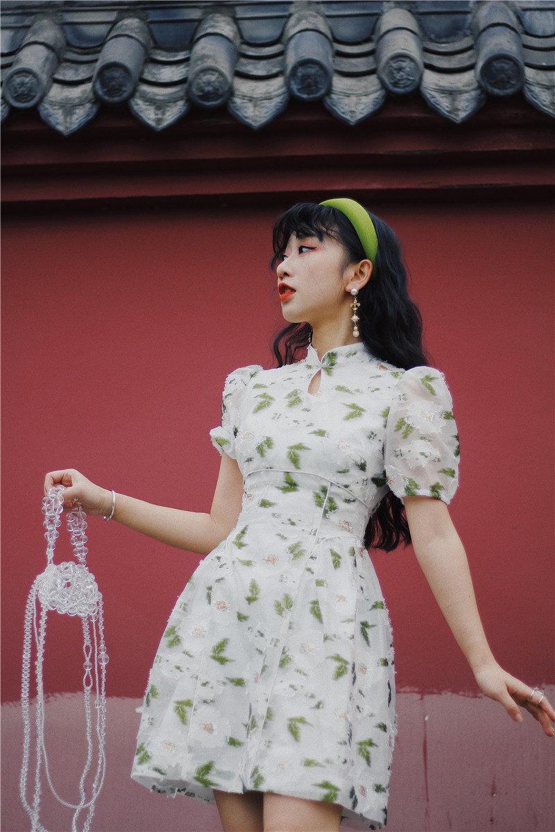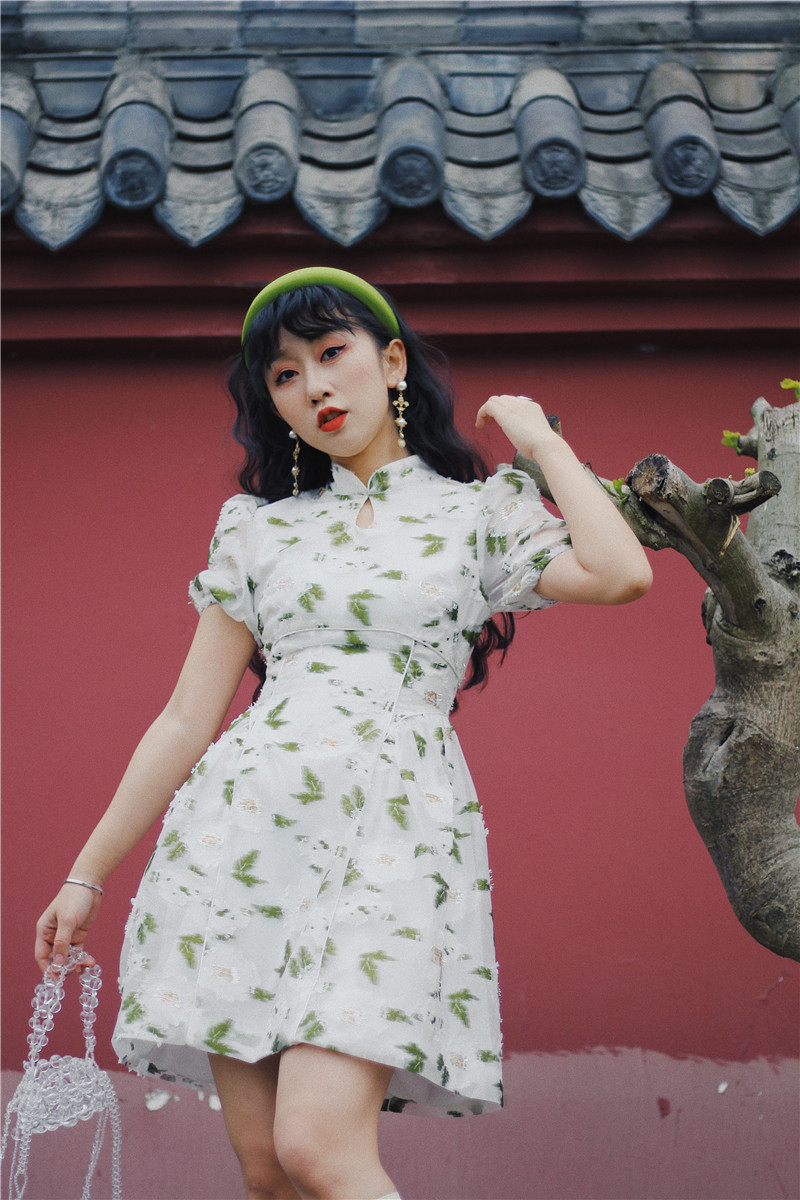 Chicks chick original "Spring Dot Round Dance Song" Solid Jacquard Girl Sensation Cute China Wind Short Qipao Princess Sleeve