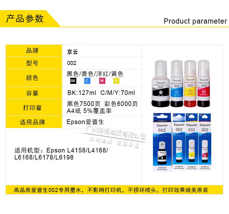 Jingyun 002 ink is suitable for Epson ink tank printer Epson L4158 L4168 L6168