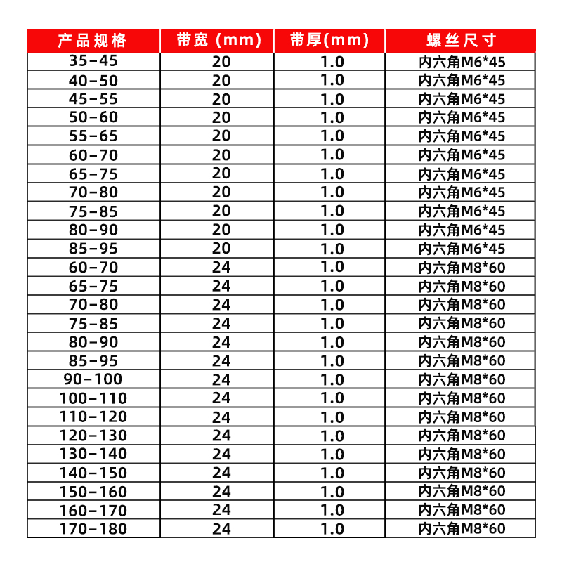 30-40 (width 20mm) 35-45 (width 20mm) 40-50 (width 20mm) 45-55 (width 20mm) 50-60 (width 2)