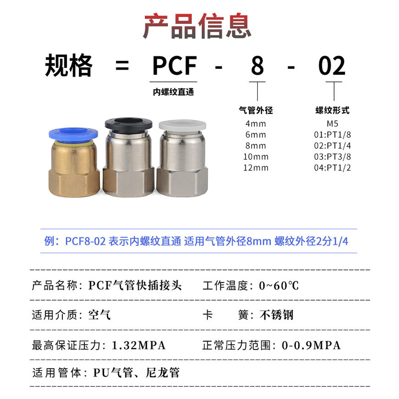 Quick connector PCF copper inner thread pneumatic inner wire quick plug connector trachea 4-01 6-02 8 10 12mm