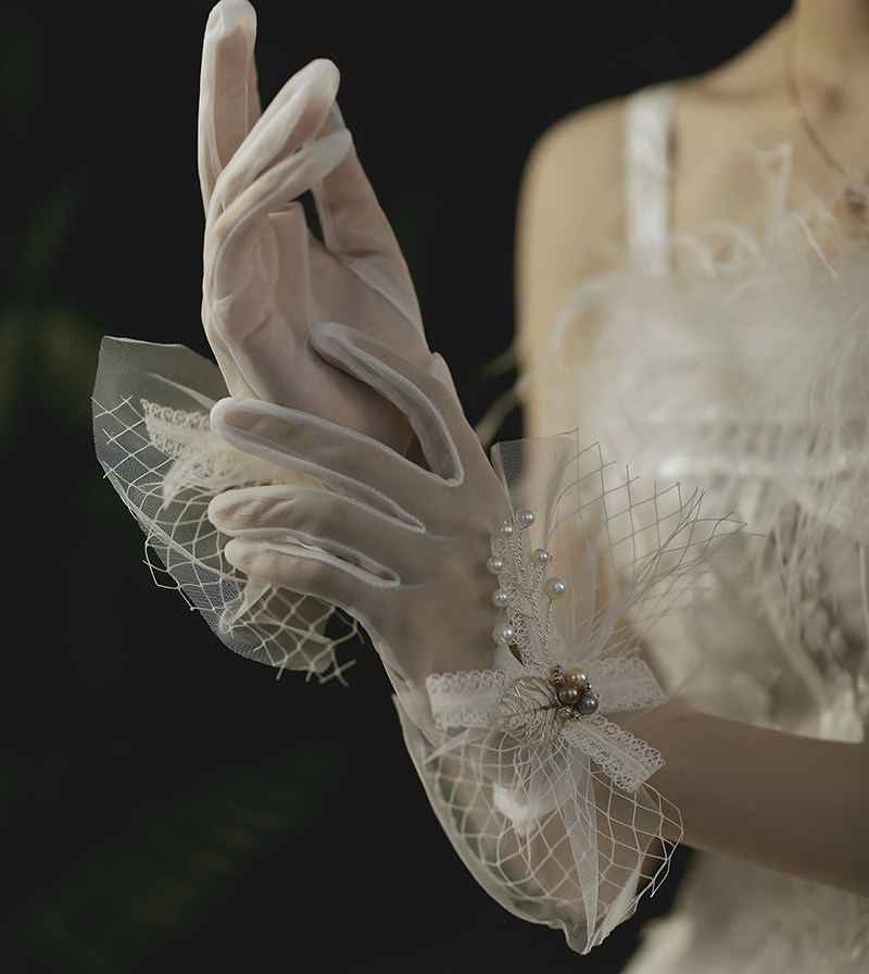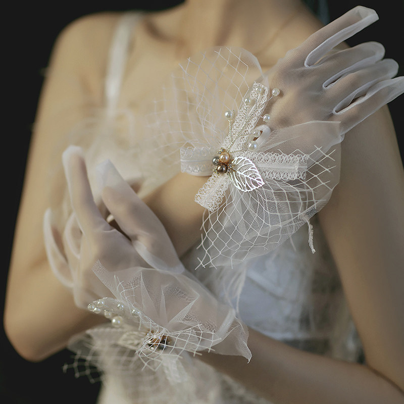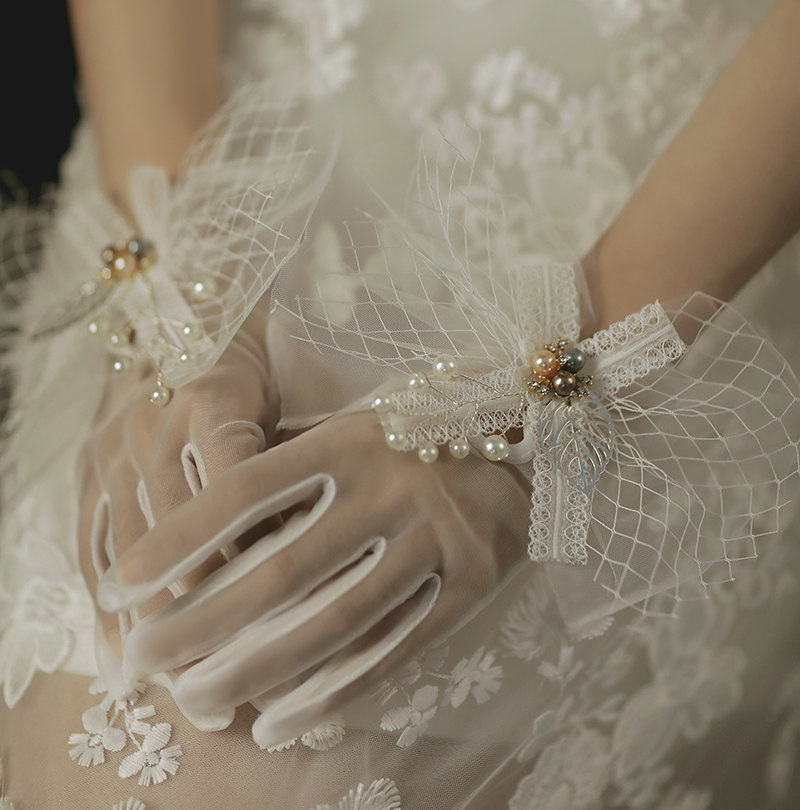 Bride's new super-fairy gloves only beauty retro photography flowers Pearl wedding dress accessories white saussen
