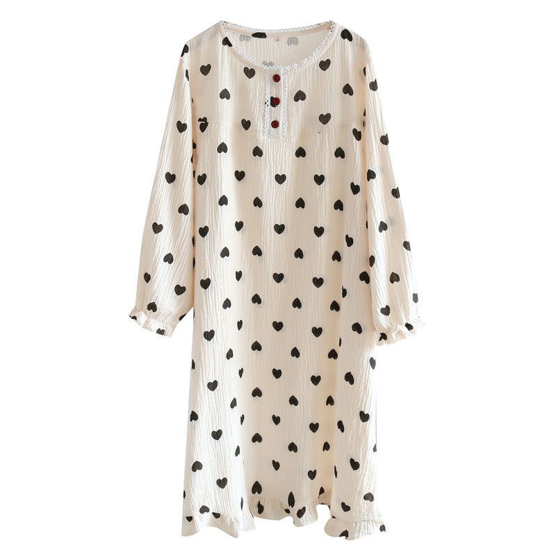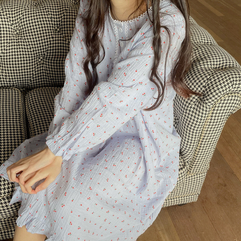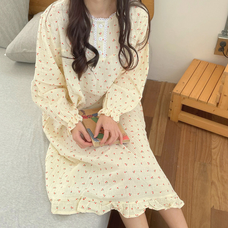 Sweet And Cute Sleeping Dress Woman Pure Cotton Gauze Long Sleeves Mid Length Dress Sleepwear Spring Autumn Summer Large Size Relaxation Student's Home Clothes