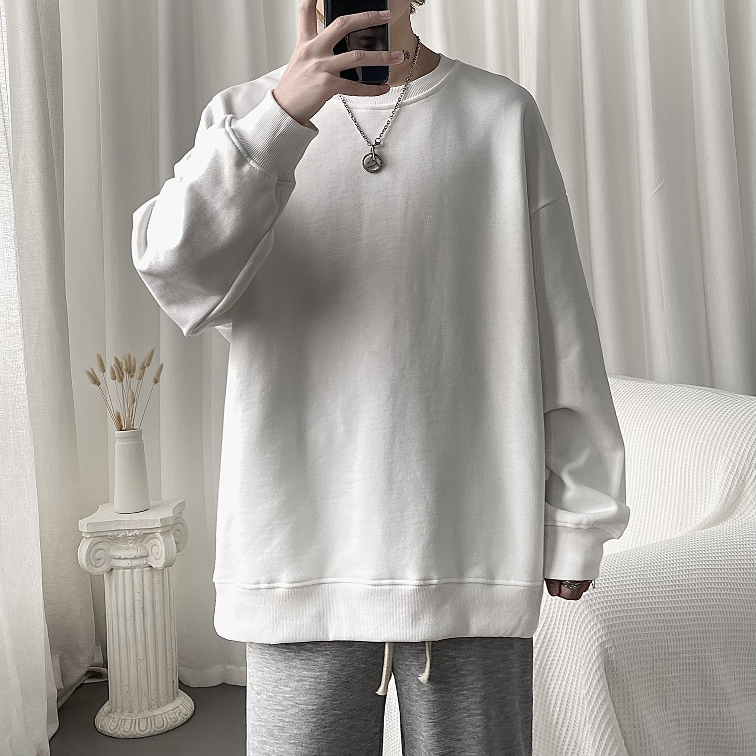 2021 Spring new 100 hitch pure color round collar lovers thick T-shirt men's spring and autumn, thin and easy harbor wind blouses