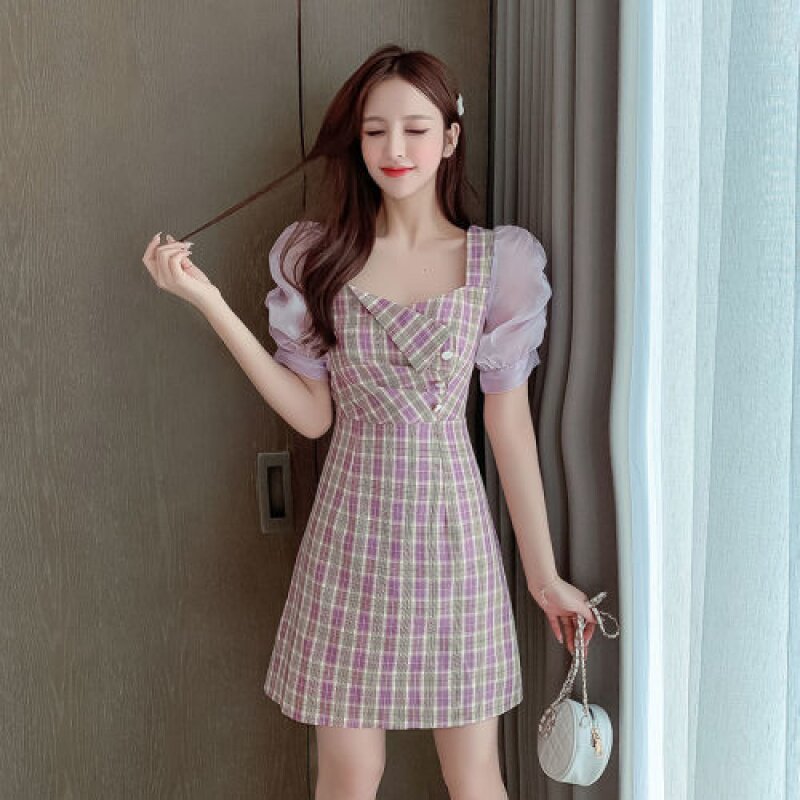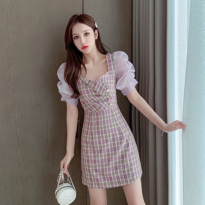 Qipao elegant pink plaid with body dress 2022 Summer new retro side Led Bubble Temperament Foreign Dress Women