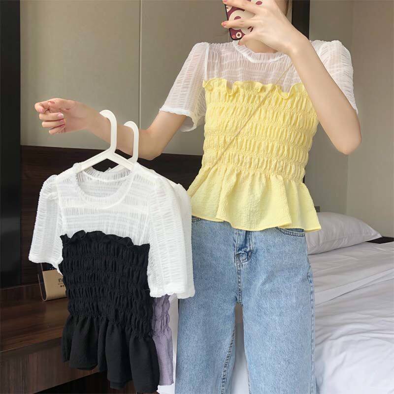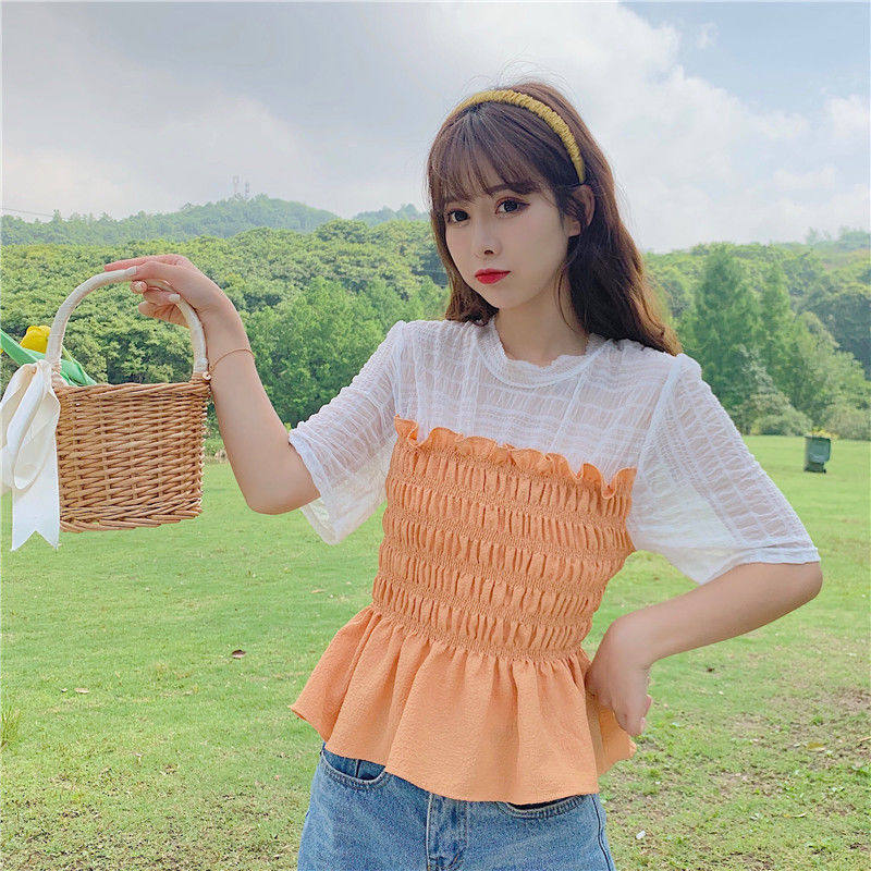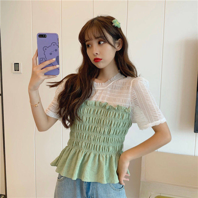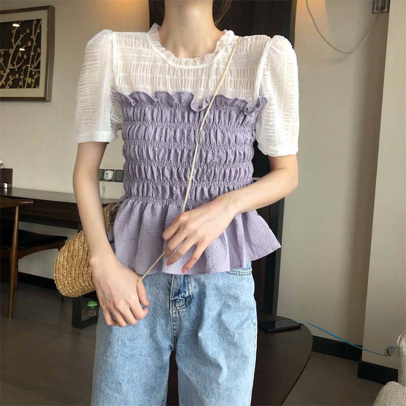 Snowspun shirt 2022 Summer new net red sweet and small fresh splicing fake two foreign pie short sleeve blouses woman