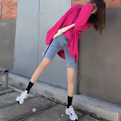 Pregnant women denim shorts spring and autumn thin wear black tight hole five-point pants fashion riding pants tide