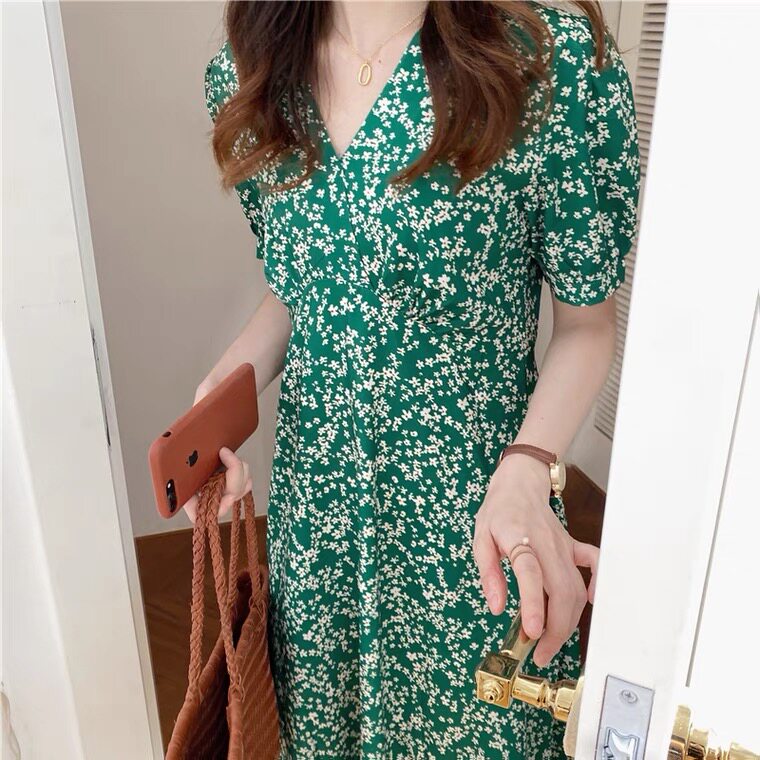 French Style Green Shattering Ocean Dress Summer Bubble Cuff V Collar Retro Temperament Long Version Advanced Sensational Snowspun Long Skirt