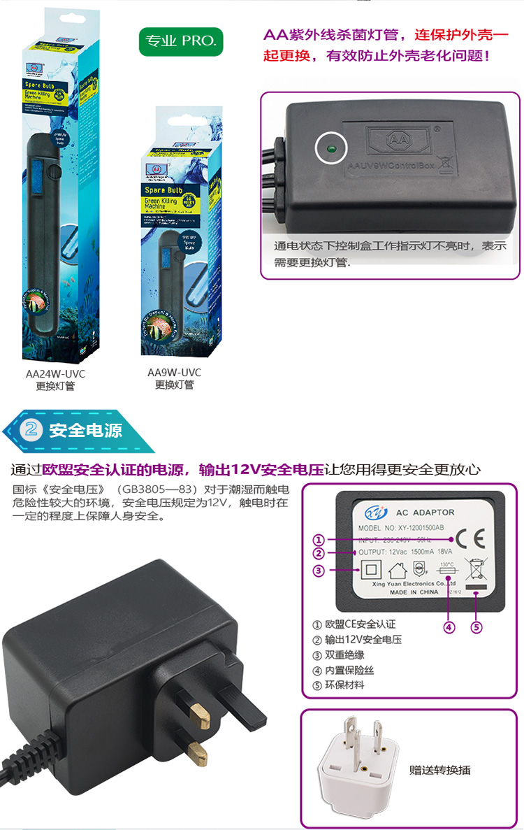 AA aquarium UV disinfection lamp diving ultraviolet germicidal lamp to remove green algae fish tank water purification UV24W control box all black