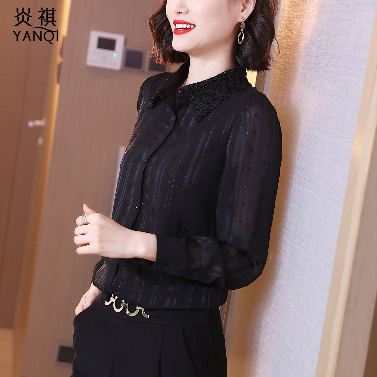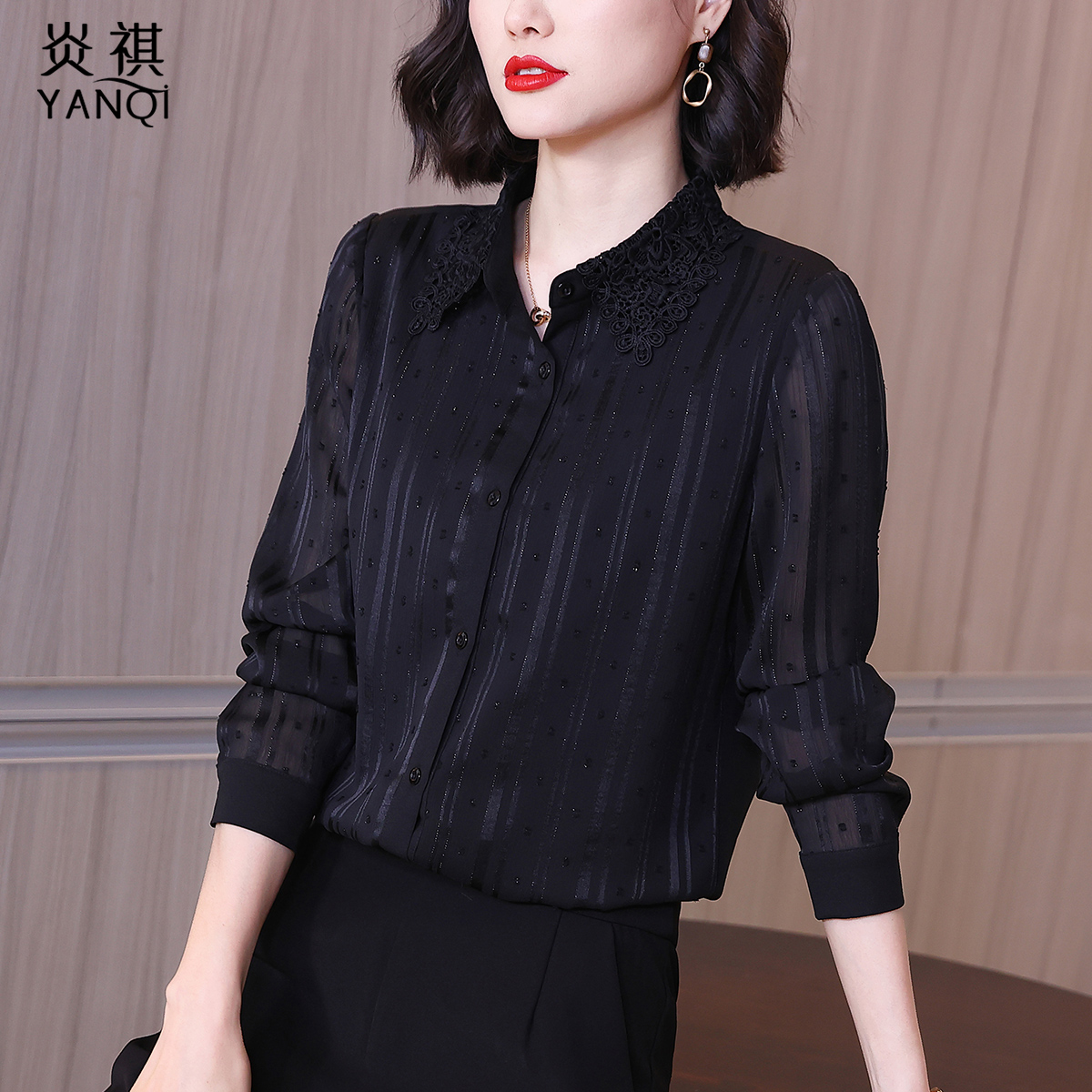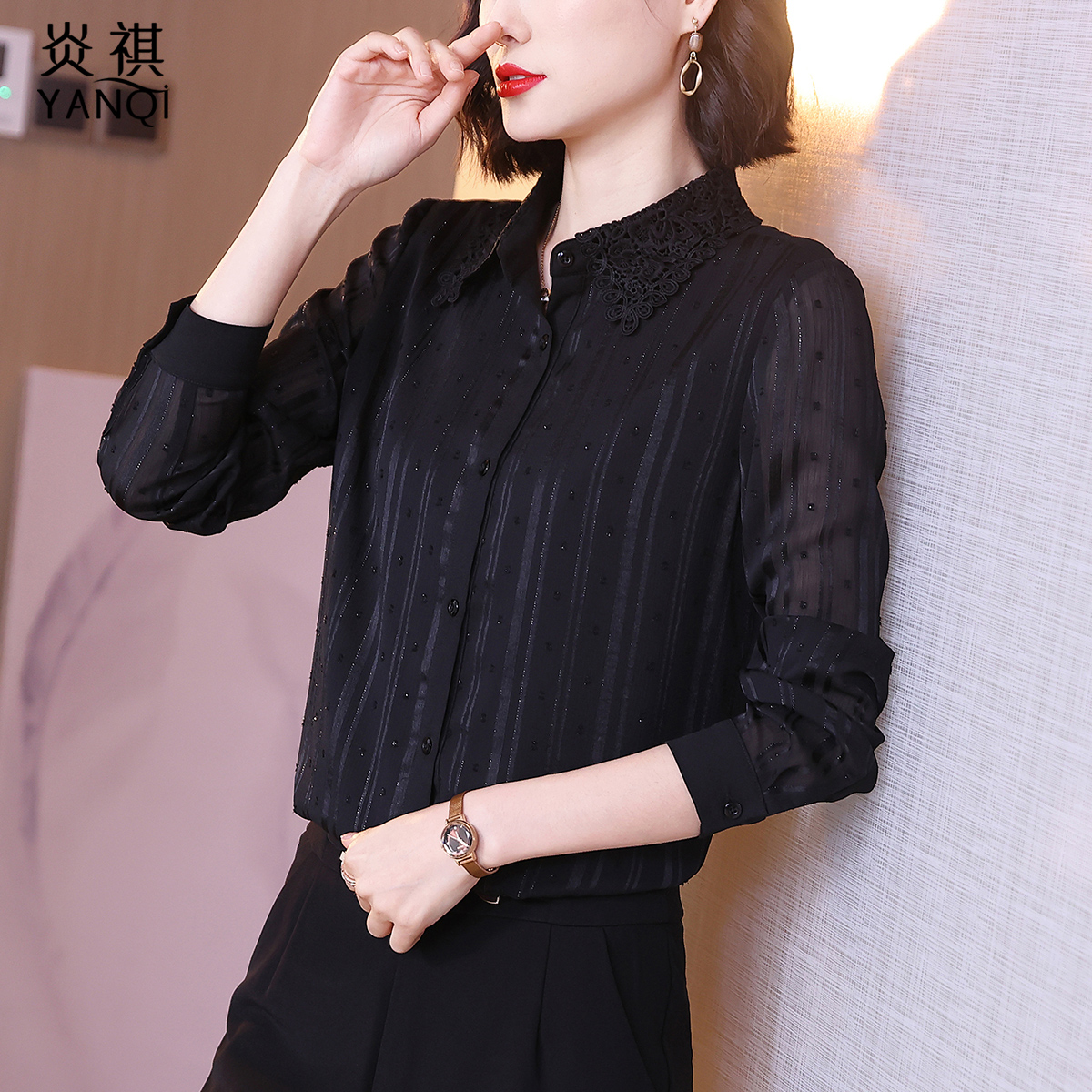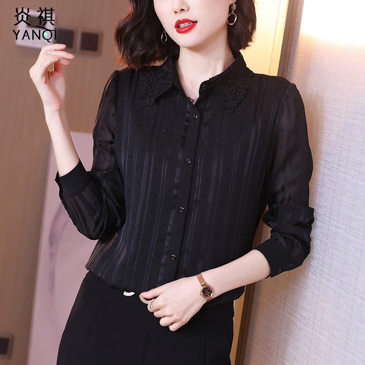 Lady Black Long Sleeve Temperament Snowspinning Shirt 2022 Autumn Dress New Woman Taste Noble Shirt Fashion 100 lap upsets