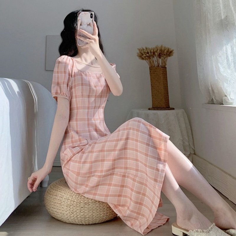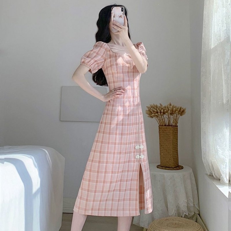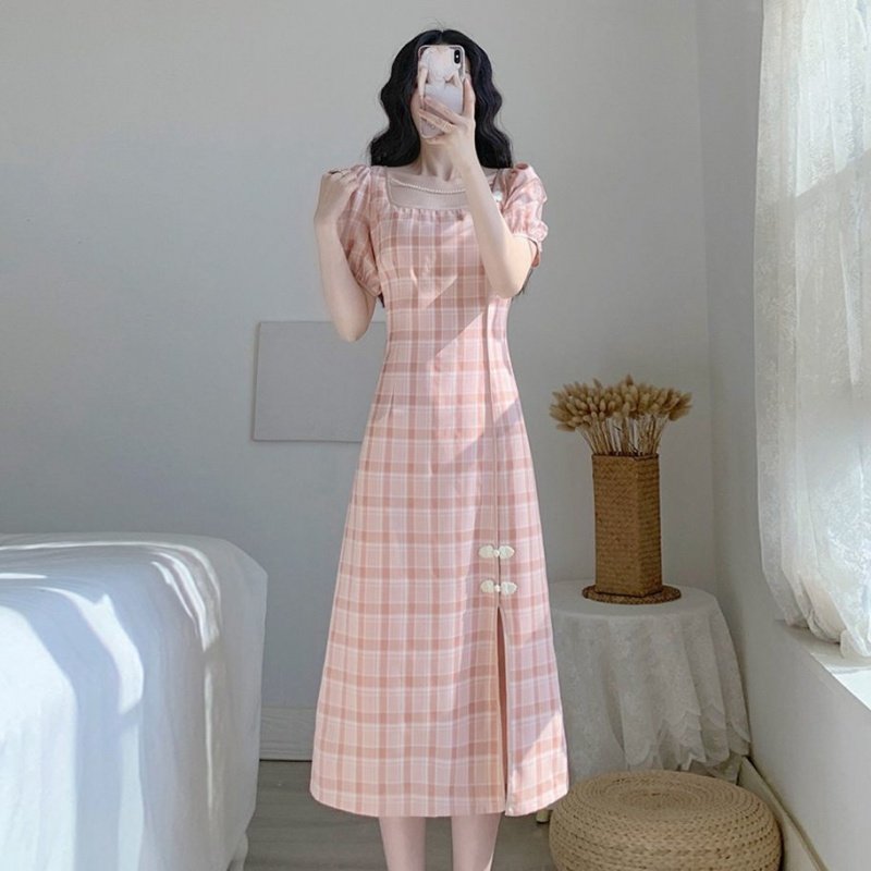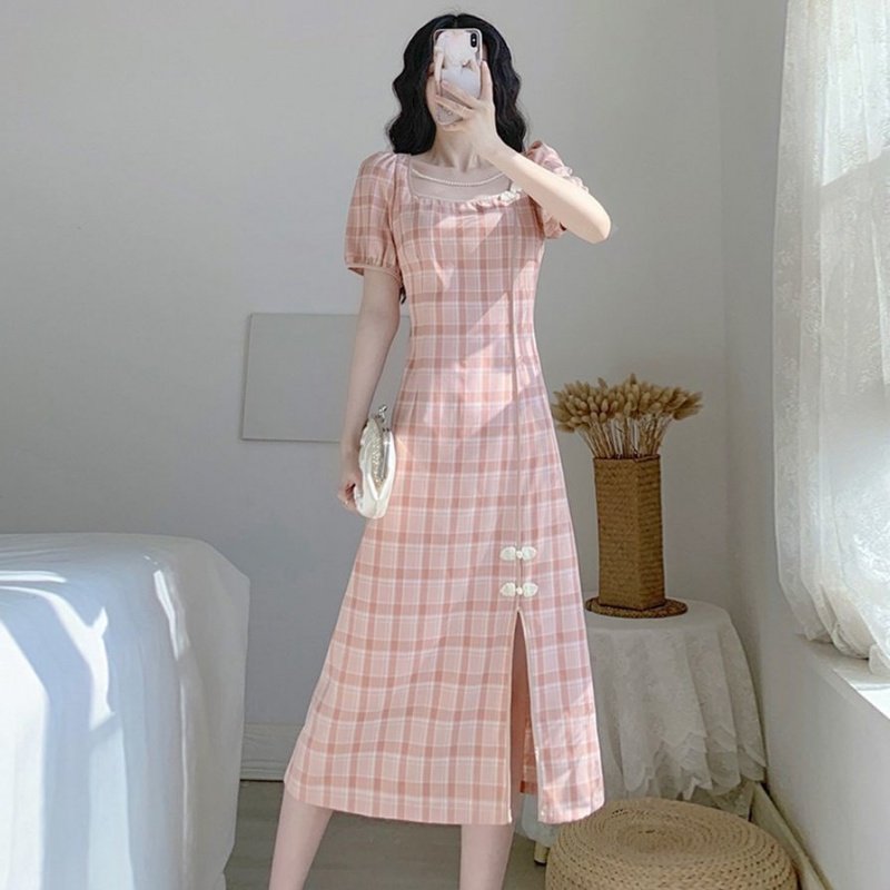 2022 skirt women's summer new slim temperament tea break French retro niche sweet plaid cheongsam dress