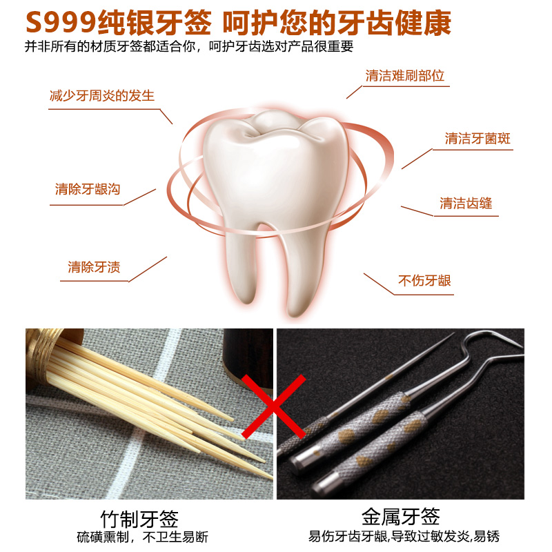999 Pure Silver Toothpicks Personal Home Oral Cleaning Care Tool Tooth Slit Double Head Toothless Needle Single portable