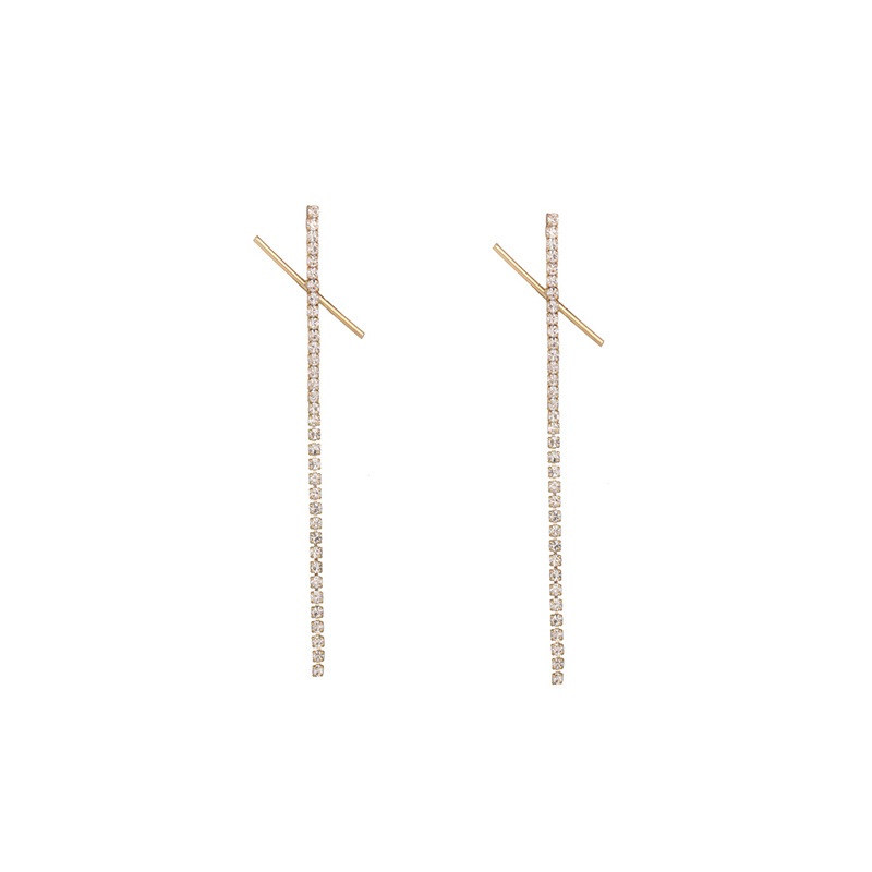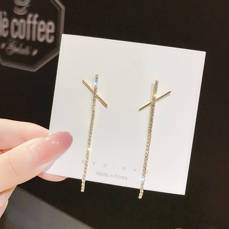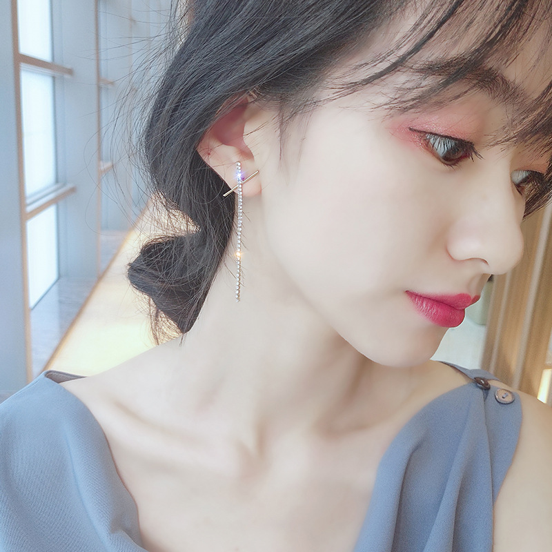 S925 silver needle new earrings Korean version of high-end rhinestones long tassel face-lifting ear needles cross personality earrings female
