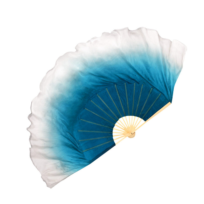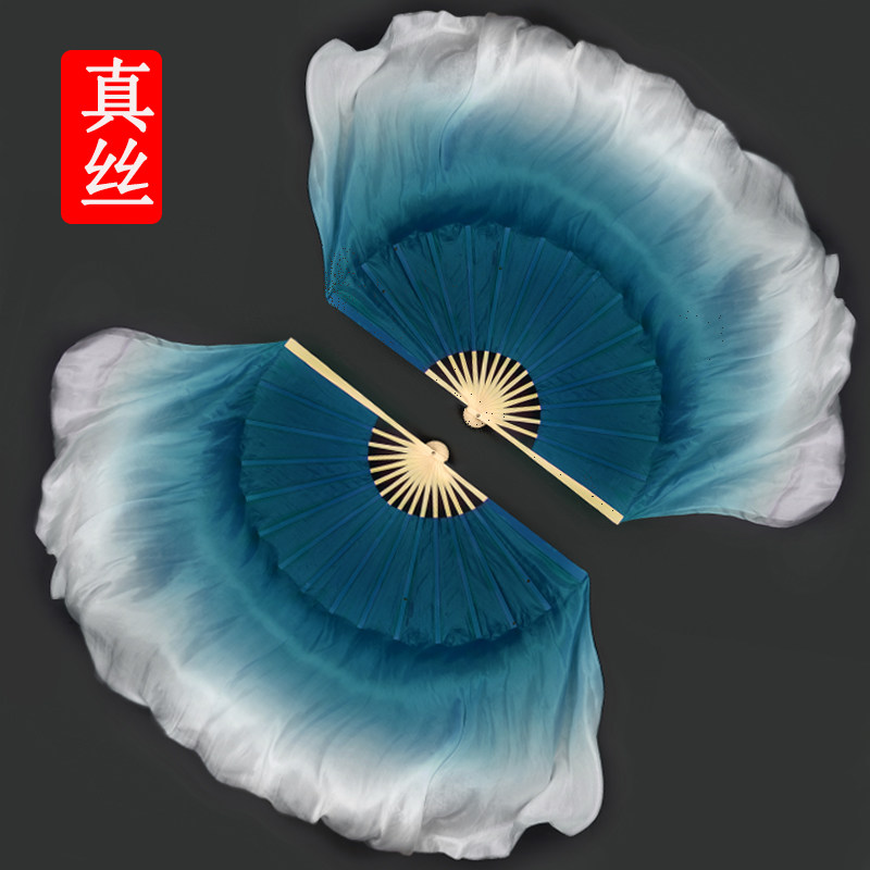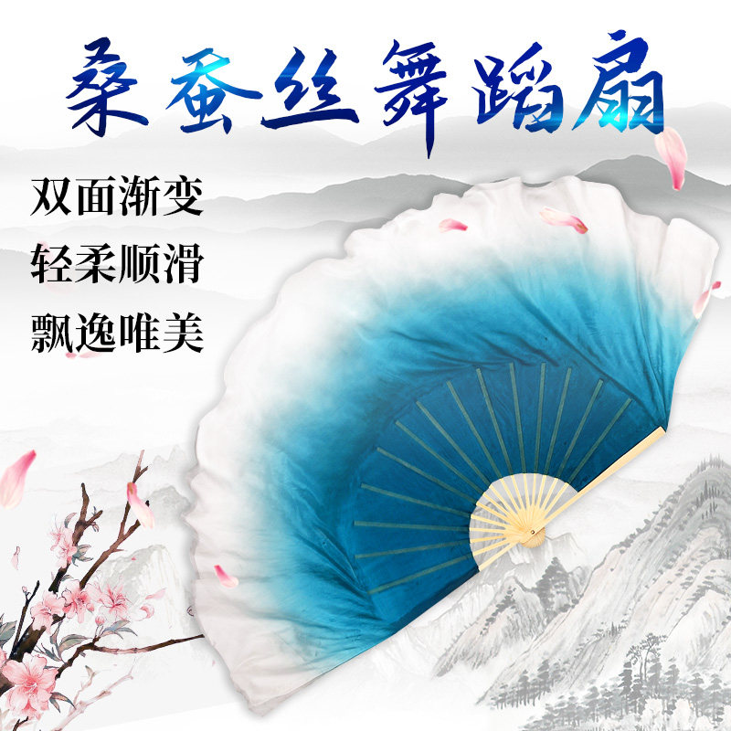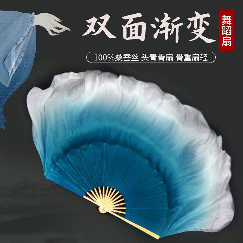 Dancing Fan Lone Moon Gallots Vintage Book Brief Classical Dance Fan Folk Dance Fan Genuine Silk Bifacial Lengthened Ink Blue Asymptotic Color