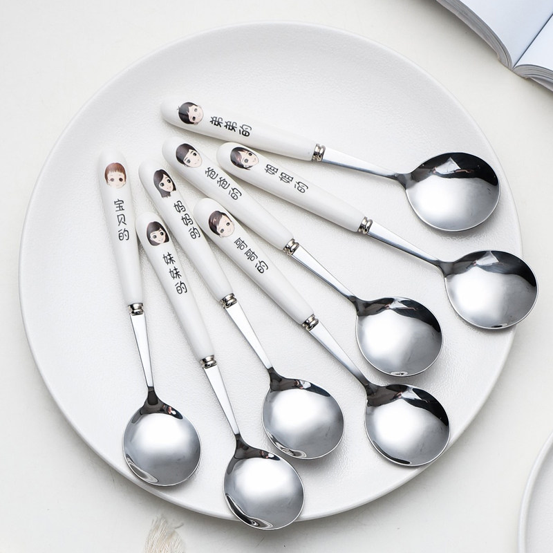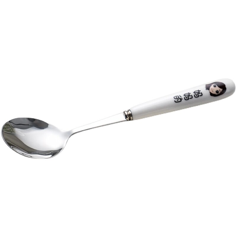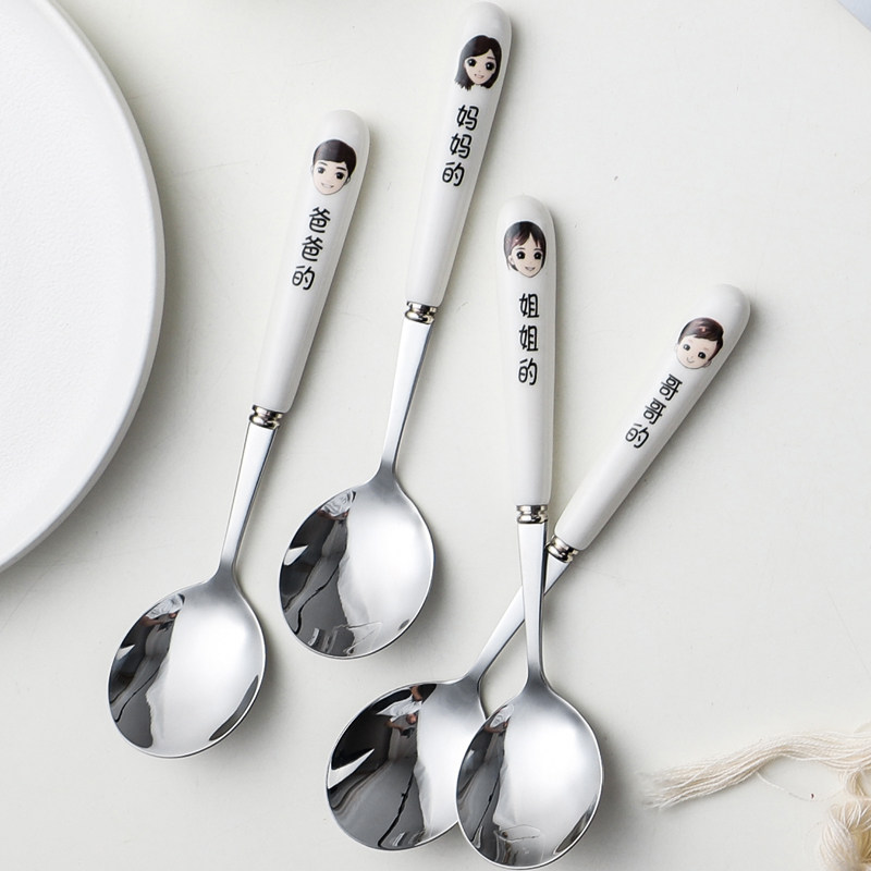 Stainless steel spoon thickened home parent-child family four-mouth ceramic handle adult children long handle rice spoon soup spoon creative