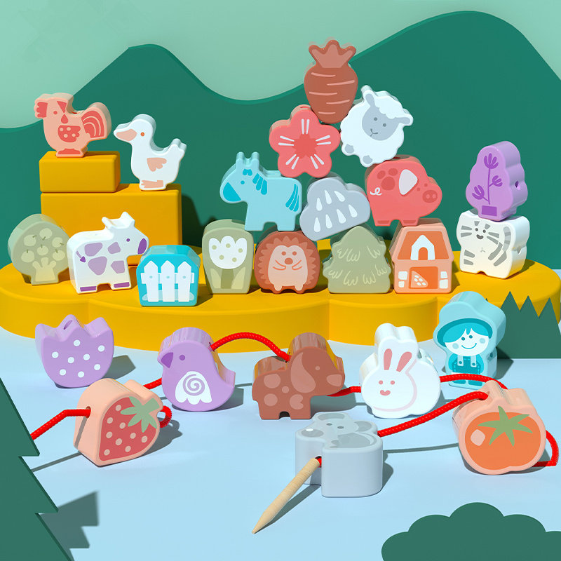 (15 digital symbol string beads) (35 digital symbol balls) (51 alphanumeric balls) (23 fruits and vegetables) (22 animals) (22 cartridges of transport) (3