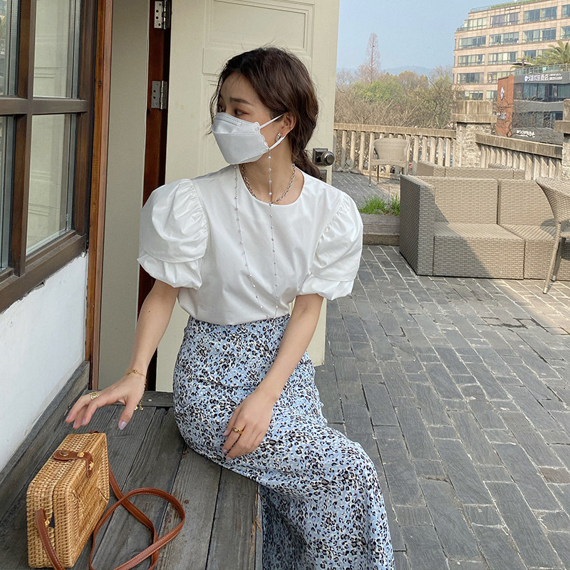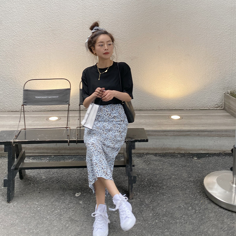 Jinsu a blue spotted half - body skirt 2022 Spring and summer Han edition high waist slim a - letter skirt chic open skirt