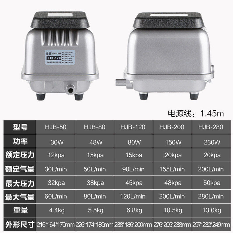 HJB-50 30 Watt Silent High Pressure Air Pump HJB-50 30 Watt + Stop Valve 10 + 20 m Tubing + Bubble Stone 10 HJB-80 45 Watt Silent High Pressure Air Pump HJB-80 45 W + Stop Valve 12 + Trachea 24 m + Bubble Stone 12 HJB-100 65 Watt Silent High Pressure Air Pump HJB-100 65 Watt + Stopper Valve 16 + Trachea 48 m + Bubble Stone 16 HJB-100 65 Watt + Stopper Valve 16 + Trachea 48 m + Bread Bubble Stone 16 HJB-120 80 watt silent high pressure air pump HJB-120 80 watts + stop valve 16 + trachea 48 meters + bubble stone 16 HJB-120 80 watts + stop valve 16 + trachea 48 meters + bread bubble stone 16 HJB-200 150 watts silent high pressure air pump HJB-200 150 watts + stop valve 36 + 72 meters pipe + bubble stone 36 HJB-200 150 watts + stop valve 36 + 72 meters + bread bubble stone 36 HJB-280 230 watts silent high pressure air pump HJB-280 230 watts + stop valve 36 + trachea 72 meters + bubble stone 36 HJB-280 230 watts + stop valve 36 + 72 meters + bread bubble stone 36 HJB-400 300 watts silent high pressure air pump HJB-550 420 watts silent high pressure air pump