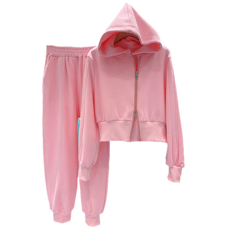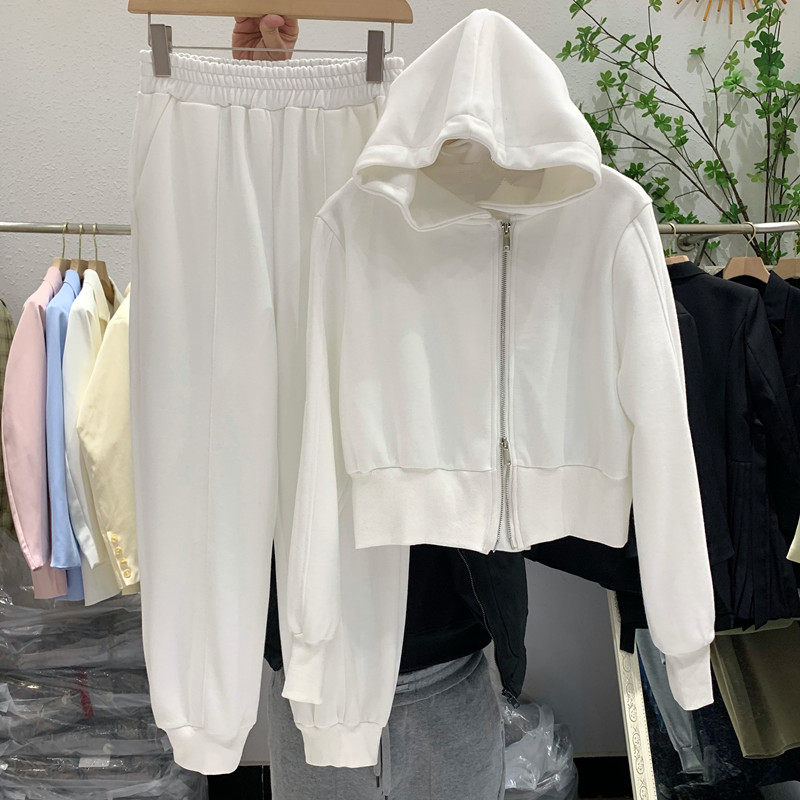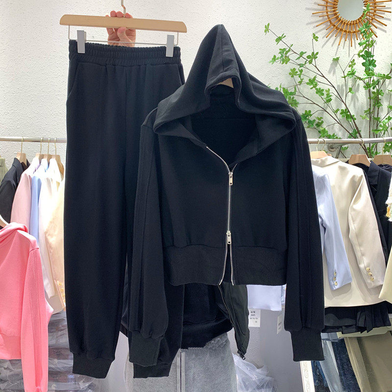 Gray hooded sportswear two-piece suit female 2021 spring and autumn new loose zipper sweater pants casual suit - Taobao