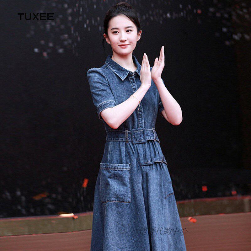 Liu Yifei stars with the same paragraph 22 Early spring and Xia's new body and thin fashion Temperament Denim to collect waist and foreign dress