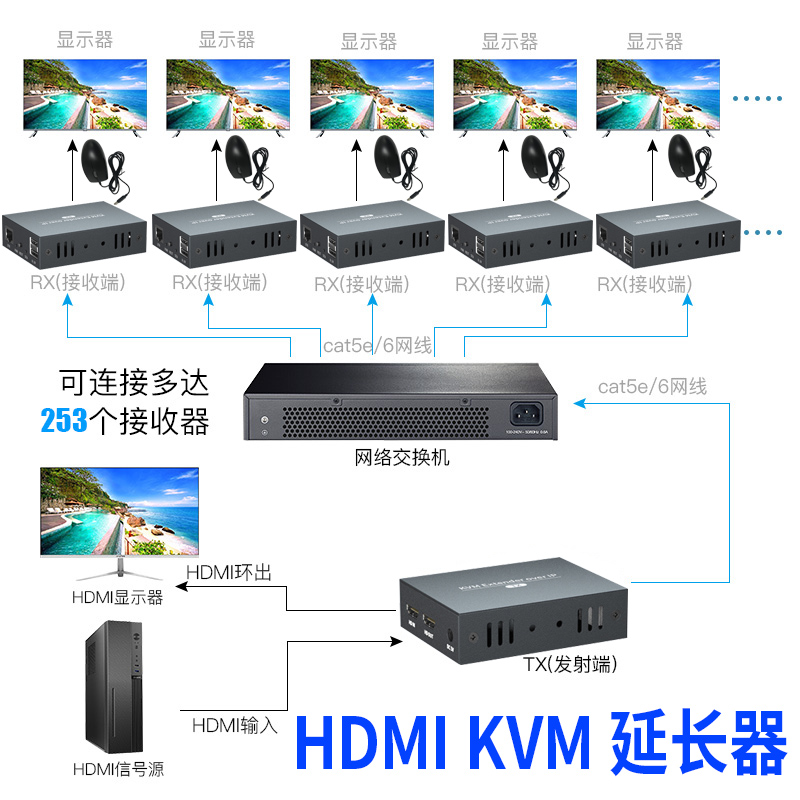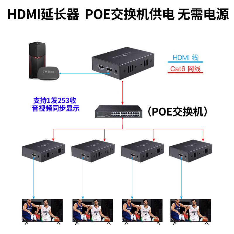 A pair of multi HDMI extender transmitters a pair of multi-HDMI extender receivers a pair of multi-POE extender transmitters a multi-POE extender receiver multiple-to-multi-extension device
